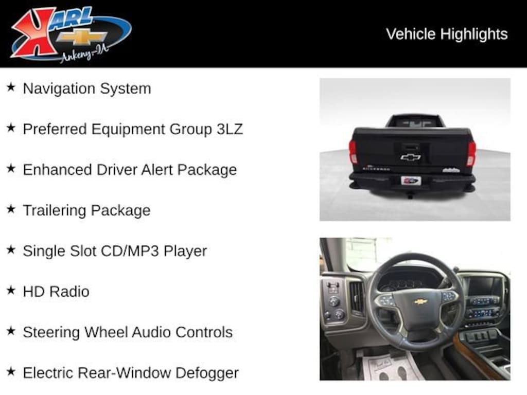 At Karl Chevrolet we want to help you find the best new or used car in Ankeny that suits your needs. When you buy a new car at Karl Chevrolet you know you're finding a vehicle you can rely on. We have a great selection of Platinum Quality Pre-Owned Vehicles. We also pride ourselves in creating a friendly atmosphere and a reliable Dealership that you can trust. Call us and our experts will be glad to help you! (515) 299-4300. *Equipment and options are generated by a 3rd party vendor, exact vehicle options may vary. Please see a salesperson for complete details and vehicle information.