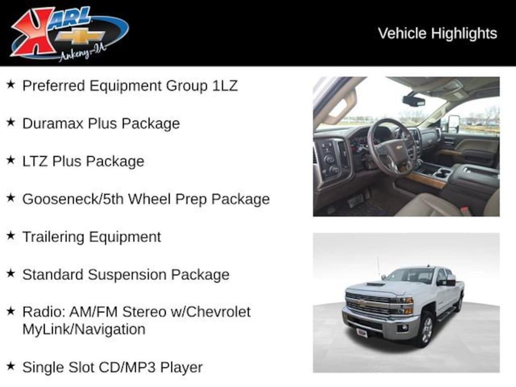 At Karl Chevrolet we want to help you find the best new or used car in Ankeny that suits your needs. When you buy a new car at Karl Chevrolet you know you're finding a vehicle you can rely on. We have a great selection of Platinum Quality Pre-Owned Vehicles. We also pride ourselves in creating a friendly atmosphere and a reliable Dealership that you can trust. Call us and our experts will be glad to help you! (515) 299-4300. *Equipment and options are generated by a 3rd party vendor, exact vehicle options may vary. Please see a salesperson for complete details and vehicle information.
