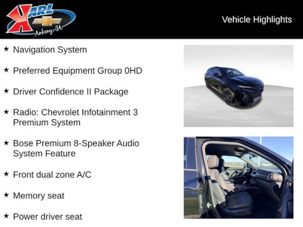 Recent Arrival! CARFAX One-Owner & Local Trade! Clean CARFAX. Certified. Black 2019 Chevrolet Blazer Premier AWD 4DR PREMIER 3.6L V6 SIDI DOHC VVT AWD, Advanced Adaptive Cruise Control, Apple CarPlay/Android Auto, Bose Premium 8-Speaker Audio System Feature, Driver Confidence II Package, Forward Automatic Braking, Forward Collision Alert, Front & Rear Black Bowtie Emblems (LPO), Front dual zone A/C, HD Surround Vision, Heated Driver & Front Passenger Seats, Heated rear seats, Heated steering wheel, IntelliBeam Headlamps, Lane Keep Assist w/Lane Departure Warning, Memory Settings For Driver Seat & Exterior Mirrors, Navigation System, Power driver seat, Preferred Equipment Group 0HD, Radio: Chevrolet Infotainment 3 Premium System, Rear Camera Mirror, Safety Alert Seat, Ventilated Driver & Front Passenger Seats, Wheels: 20 Gloss Black Aluminum (LPO), Wheels: 20 Transit, Wireless Charging. 18/25 City/Highway MPG 9-Speed Automatic AWDAt Karl Chevrolet we want to help you find the best new or used car in Ankeny that suits your needs. Check out the 2019 Chevrolet Blazer For Sale in Ankeny, IA. When you buy a new car at Karl Chevrolet you know you're finding a vehicle you can rely on. We have a great selection of Platinum Quality Pre-Owned Vehicles. We also pride ourselves in creating a friendly atmosphere and reliable new car dealership that you can trust. Call us with any questions about our 2019 Chevrolet Blazer and our experts will be glad to help you! (515) 299-4300. *Equipment and options are generated by a 3rd party vendor, exact vehicle options may vary. Please see a salesperson for complete details and vehicle information.Certification Program Details: Karl Chevrolet of Ankeny, The Nation's #1 CarBravo certified dealer, where platinum quality vehicles and unmatched benefits come together! This vehicle qualifies for our CarBravo Certified program reserved for the highest-quality pre-owned vehicles that are 10 model years or newer and have less than 100,000 miles. Every CarBravo Certified vehicle includes: ? Comprehensive 126-Point Inspection Professionally inspected by factory-trained technicians to meet strict mechanical, safety, and cosmetic standards. ? 6-Month / 6,000-Mile Bumper-to-Bumper Limited Warranty Enjoy added peace of mind with extensive coverage from the day you drive off the lot. ? 24/7 Roadside Assistance & Courtesy Transportation Flat tire? Dead battery? Need a tow? You're covered anywhere, anytime throughout the warranty period. ? Vehicle History & Title Guarantee Clean title, completed safety recalls, and a full CARFAX® or AutoCheck® report provided for complete transparency. ? 10-Day / 500-Mile Exchange Promise If you don't absolutely love it, bring it back and exchange it no hassle, no stress. Experience peace of mind and premium protection exclusively from Karl Chevrolet of Ankeny, the Nation's #1 CarBravo Certified Deale