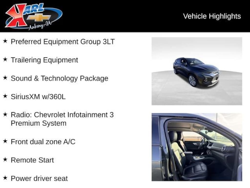 Certification Program Details: Karl Chevrolet of Ankeny, The Nation's #1 CarBravo Certified Dealer! Every CarBravo Certified vehicle includes: Comprehensive 126-Point Inspection Professionally inspected by factory-trained technicians to meet strict mechanical, safety, and cosmetic standards. 12-Month / 12,000-Mile Bumper-to-Bumper Limited Warranty Enjoy added peace of mind with extensive coverage from the day you drive off the lot. 24/7 Roadside Assistance & Courtesy Transportation Flat tire? Dead battery? Need a tow? You're covered anywhere, anytime throughout the warranty period. Vehicle History & Title Guarantee Clean title, completed safety recalls, and a full CARFAX® or AutoCheck® report provided for complete transparency. 10-Day / 500-Mile Exchange Promise If you don't absolutely love it, bring it back and exchange it no hassle, no stress. Experience peace of mind and premium protection exclusively from Karl Chevrolet of Ankeny, the Nation's #1 CarBravo Dealer!- Sunroof, Power Panoramic, Tilt-Sliding with Power Sunshade- 3.6L V6 SIDI DOHC VVT- Gloss Black Emblem Kit (LPO)- Front & Rear Black Bowtie Emblems (LPO)- Wheels, 20 Bright Silver AluminumThis 2020 Chevrolet Blazer LT AWD 4DR LT W/3LT is an exceptional SUV that combines style, performance, and advanced technology. Powered by a robust 3.6L V6 engine mated to a smooth 9-speed automatic transmission, this Blazer delivers a confident and responsive driving experience, whether you're navigating city streets or venturing off the beaten path. The available all-wheel-drive system ensures optimal traction and control in all weather conditions.Step inside and you'll be greeted by a spacious and well-appointed cabin, featuring premium materials and thoughtful design touches. The Blazer's impressive list of standard and available features, including the Power Panoramic Sunroof, Bose Premium Audio System, and Chevrolet Infotainment 3 Premium System with connected Navigation, elevate the driving experience and keep you connected on the go.Safety is also a top priority, with advanced driver-assistance technologies like Rear Camera Mirror, Rear Cross-Traffic Alert, and Rear Park Assist, providing an extra layer of confidence and protection. Whether you're transporting the family, hauling cargo, or seeking an adventurous weekend getaway, this Blazer is up for the challenge.As a CarBravo Certified pre-owned vehicle, this 2020 Chevrolet Blazer LT AWD 4DR LT W/3LT has undergone a rigorous 126-point inspection and comes with a comprehensive 12-month/12,000-mile bumper-to-bumper limited warranty, 24/7 roadside assistance, and a vehicle history and title guarantee. Experience the peace of mind and premium protection that comes with owning a CarBravo Certified vehicle from Karl Chevrolet of Ankeny, the Nation's #1 CarBravo Dealer.At Karl Chevrolet we want to help you find the best new or used car in Ankeny that suits your needs. When you buy a new car at Karl Chevrolet you know you're finding a vehicle you can rely on. We have a great selection of Platinum Quality Pre-Owned Vehicles. We also pride ourselves in creating a friendly atmosphere and a reliable Dealership that you can trust. Call us and our experts will be glad to help you! (515) 299-4300. *Equipment and options are generated by a 3rd party vendor, exact vehicle options may vary. Please see a salesperson for complete details and vehicle information.