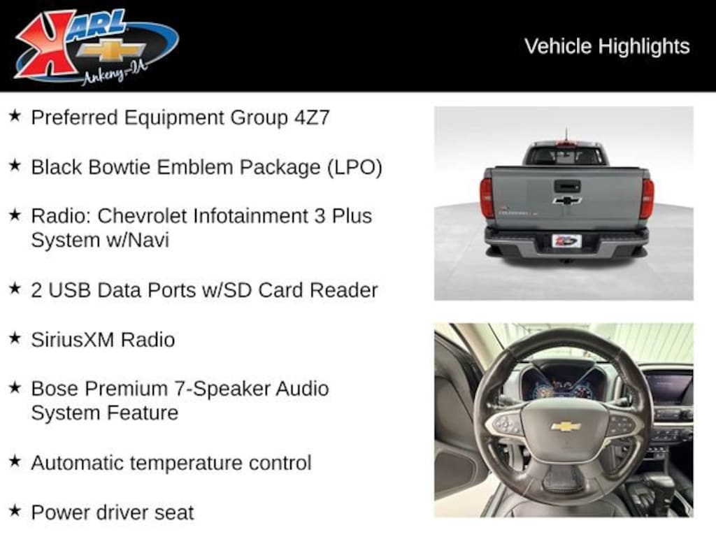 At Karl Chevrolet we want to help you find the best new or used car in Ankeny that suits your needs. Check out the 2020 Chevrolet Colorado For Sale in Ankeny, IA. When you buy a new car at Karl Chevrolet you know you're finding a vehicle you can rely on. We have a great selection of Platinum Quality Pre-Owned Vehicles. We also pride ourselves in creating a friendly atmosphere and reliable new car dealership that you can trust. Call us with any questions about our 2020 Chevrolet Colorado and our experts will be glad to help you! (515) 299-4300. *Equipment and options are generated by a 3rd party vendor, exact vehicle options may vary. Please see a salesperson for complete details and vehicle information.