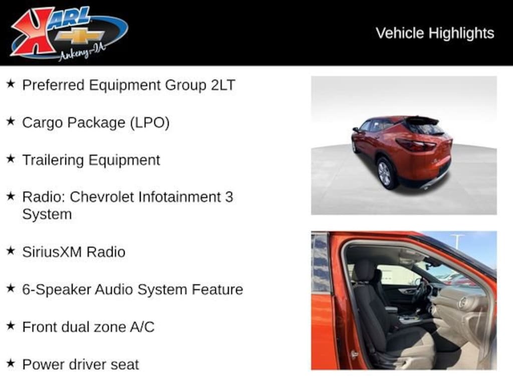 At Karl Chevrolet we want to help you find the best new or used car in Ankeny that suits your needs. Check out the 2021 Chevrolet Blazer For Sale in Ankeny, IA. When you buy a new car at Karl Chevrolet you know you're finding a vehicle you can rely on. We have a great selection of Platinum Quality Pre-Owned Vehicles. We also pride ourselves in creating a friendly atmosphere and reliable new car dealership that you can trust. Call us with any questions about our 2021 Chevrolet Blazer and our experts will be glad to help you! (515) 299-4300. *Equipment and options are generated by a 3rd party vendor, exact vehicle options may vary. Please see a salesperson for complete details and vehicle information.