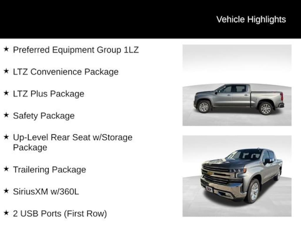 10-Way Power Driver Seat w/Lumbar, 10-Way Power Passenger Seat Adjuster w/Lumbar, 12-Volt Rear Auxiliary Power Outlet, 120-Volt Bed Mounted Power Outlet, 120-Volt Instrument Panel Power Outlet, 2 USB Ports, 2 USB Ports (First Row), 4.2 Diagonal Color Display Driver Info Center, 4G LTE Wi-Fi Hot Spot Capable, 6-Speaker Audio System, Advanced Trailering System, Auto-Dimming Inside Rear-View Mirror, Auto-Locking Rear Differential, Auxiliary External Transmission Oil Cooler, Bluetooth® For Phone, Chevrolet Connected Access Capable, Chrome Grille, Chrome Mirror Caps, Color-Keyed Carpeting Floor Covering, Compass, Deep-Tinted Glass, Driver Memory, Electric Rear-Window Defogger, Electrical Lock Control Steering Column, Electronic Cruise Control, Floor Mounted Center Console, Front Frame-Mounted Black Recovery Hooks, Front LED Fog Lamps, Front Rubberized Vinyl Floor Mats, HD Rear Vision Camera, Heated Driver & Front Outboard Passenger Seats, Heated Steering Wheel, Hitch Guidance, Hitch Guidance w/Hitch View, Integrated Trailer Brake Controller, Keyless Open & Start, Lane Change Alert w/Side Blind Zone Alert, Leather Wrapped Steering Wheel, LED Cargo Area Lighting, LTZ Convenience Package, LTZ Plus Package, Manual Tilt/Telescoping Steering Column, OnStar & Chevrolet Connected Services Capable, Outside Heated Power-Adjustable Mirrors, Perimeter Lighting, Power Door Locks, Power Front Passenger Windows w/Express Up/Down, Power Front Windows w/Driver Express Up/Down, Power Rear Windows w/Express Down, Power Sliding Rear Window w/Rear Defogger, Power Tailgate, Preferred Equipment Group 1LZ, Rear Cross Traffic Alert, Rear Dual USB Charging-Only Ports, Rear Rubberized-Vinyl Floor Mats, Rear Wheelhouse Liners, Remote Vehicle Starter System, Safety Package, SiriusXM w/360L, Standard Tailgate, Steering Wheel Audio Controls, Theft Deterrent System (Unauthorized Entry), Trailering Package, Ultrasonic Front & Rear Park Assist, Universal Home Remote, Up-Level Rear Seat w/Storage Package, Ventilated Driver & Front Passenger Seats, Wireless Phone Projection.