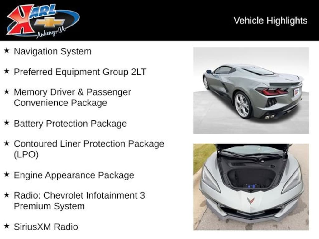 At Karl Chevrolet we want to help you find the best new or used car in Ankeny that suits your needs. Check out the 2022 Chevrolet Corvette For Sale in Ankeny, IA. When you buy a new car at Karl Chevrolet you know you're finding a vehicle you can rely on. We have a great selection of Platinum Quality Pre-Owned Vehicles. We also pride ourselves in creating a friendly atmosphere and reliable new car dealership that you can trust. Call us with any questions about our 2022 Chevrolet Corvette and our experts will be glad to help you! (515) 299-4300. *Equipment and options are generated by a 3rd party vendor, exact vehicle options may vary. Please see a salesperson for complete details and vehicle information.