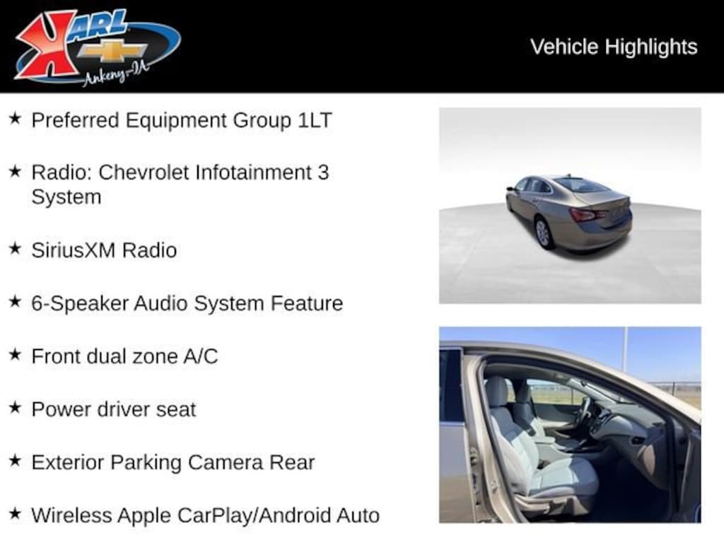Beyond its stylish appearance, the Malibu LT offers a wealth of advanced features to enhance your driving experience. Enjoy the convenience of hands-free connectivity with Wireless Apple CarPlay and Android Auto, while the Chevrolet Infotainment 3 System keeps you entertained and informed. Stay comfortable with dual-zone climate control and heated front seats, and rest assured with the added safety of the Exterior Parking Camera Rear.