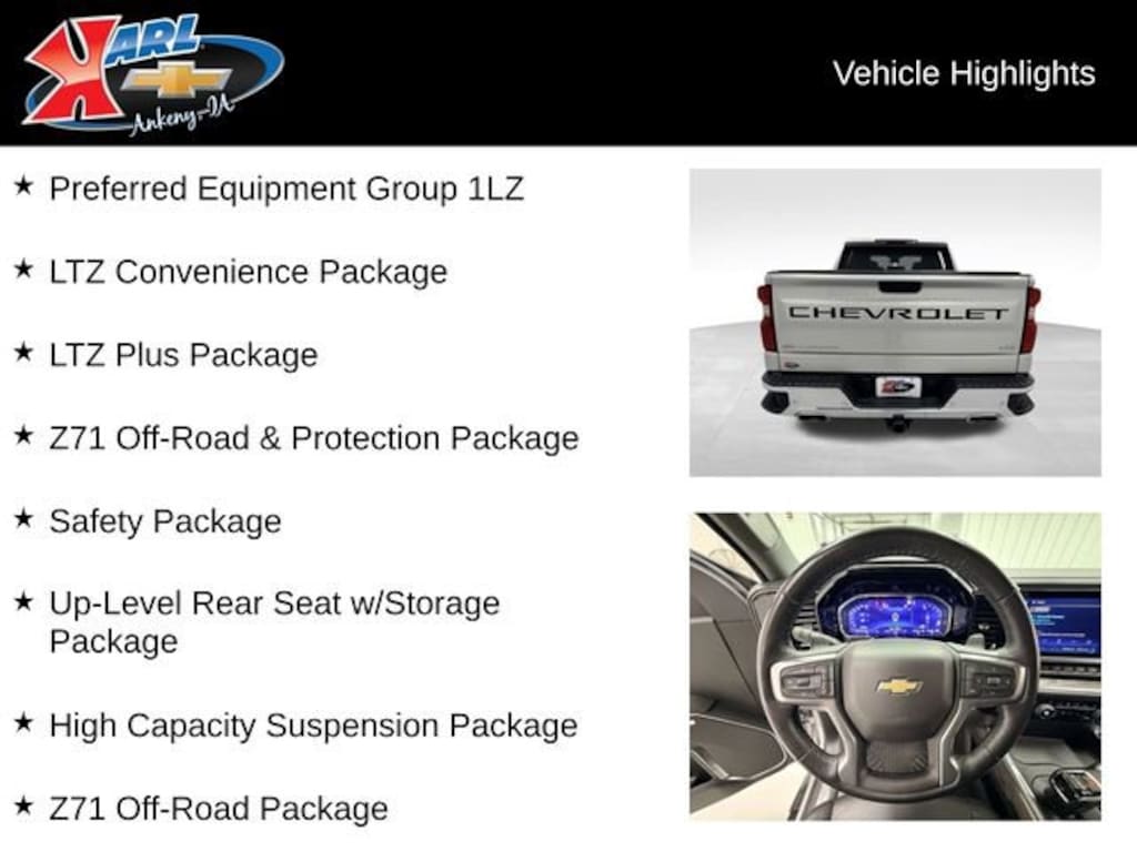 Recent Arrival! CARFAX One-Owner, Local Trade, Sold New at Karls & All Services Done at Karls! Equipped With Running Boards, Mud Flaps, Tonneau Cover & Bed Liner! Clean CARFAX. Certified. Silver Ice Metallic 2022 Chevrolet Silverado 1500 LTZ 4WD CREW CAB 147 LTZ EcoTec3 5.3L V8 10-Speed Automatic, 4WD, Jet Black Leather, 10-Way Power Driver Seat w/Lumbar, 10-Way Power Passenger Seat Adjuster w/Lumbar, 12.3 Multicolor Reconfigurable Digital Display, 2 USB Data Ports, All-Weather Floor Liner (LPO) (AAK), Apple CarPlay/Android Auto, Auto High-beam Headlights, Auto-Dimming Inside Rear-View Mirror, Auto-Locking Rear Differential, Bluetooth® For Phone, Chrome Mirror Caps, Deep-Tinted Glass, Driver Memory, Dual Exhaust w/Polished Outlets, Dual Rear USB Ports (Charge Only), Electric Rear-Window Defogger, Electrical Steering Column Lock, Electronic Cruise Control, Forward Collision Alert, Front dual zone A/C, Front Frame-Mounted Black Recovery Hooks, Front LED Fog Lamps, Front Rainsensing Wipers, Front Rubberized Vinyl Floor Mats, HD Surround Vision, Heated Steering Wheel, Heavy-Duty Air Filter, High Capacity Suspension Package, Hill Descent Control, Hitch Guidance w/Hitch View, Integrated Trailer Brake Controller, Keyless Open & Start, Lane Keep Assist w/Lane Departure Warning, Leather Wrapped Steering Wheel, LED Cargo Area Lighting, LTZ Convenience Package, LTZ Plus Package, Off-Road Suspension, OnStar & Chevrolet Connected Services Capable, Outside Heated Power-Adjustable Mirrors, Perimeter Lighting, Power Front Passenger Windows w/Express Up/Down, Power Front Windows w/Driver Express Up/Down, Power Rear Windows w/Express Down, Power Tailgate, Power Tilt & Telescoping Steering Column, Preferred Equipment Group 1LZ, Premium Bose 7-Speaker Sound System, Rain sensing wipers, Rear Cross Traffic Alert-Braking, Rear Pedestrian Detection, Rear Rubberized-Vinyl Floor Mats, Rear Wheelhouse Liners, Remote Vehicle Starter System, Safety Alert Seat, Safety Package, SiriusXM w/360L, Standard Tailgate, Steering Wheel Audio Controls, Theft Deterrent System (Unauthorized Entry), Trailer Camera Provisions, Trailer Side Blind Zone Alert, Trailering App, Trailering Package, Ultrasonic Front & Rear Park Assist, Up-Level Rear Seat w/Storage Package, Wheels: 20 x 9 Sterling Silver Painted Aluminum, Wi-Fi Hot Spot Capable, Wireless Charging, Wireless Phone Projection, Z71 Off-Road & Protection Package, Z71 Off-Road Package. 14/19 City/Highway MPG 10-Speed Automatic 4WD