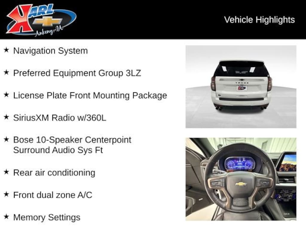 Certification Program Details: Karl Chevrolet of Ankeny, The Nation's #1 CarBravo Certified Dealer! Every CarBravo Certified vehicle includes: Comprehensive 126-Point Inspection Professionally inspected by factory-trained technicians to meet strict mechanical, safety, and cosmetic standards. 12-Month / 12,000-Mile Bumper-to-Bumper Limited Warranty Enjoy added peace of mind with extensive coverage from the day you drive off the lot. 24/7 Roadside Assistance & Courtesy Transportation Flat tire? Dead battery? Need a tow? You're covered anywhere, anytime throughout the warranty period. Vehicle History & Title Guarantee Clean title, completed safety recalls, and a full CARFAX® or AutoCheck® report provided for complete transparency. 10-Day / 500-Mile Exchange Promise If you don't absolutely love it, bring it back and exchange it no hassle, no stress. Experience peace of mind and premium protection exclusively from Karl Chevrolet of Ankeny, the Nation's #1 CarBravo Dealer!- Sunroof, Power Panoramic, Dual-Pane, Tilt-Sliding- Adaptive Cruise Control- Black Nameplates (LPO)- Black Bowtie Emblems, Front and Rear (LPO)- Molded Splash Guards (LPO)- Vertical Cargo Net (LPO)This 2022 Chevrolet Tahoe High Country 4WD is a true standout in the full-size SUV segment. With its powerful EcoTec3 6.2L V8 engine and 10-speed automatic transmission, this Tahoe delivers exceptional performance and capability, whether you're navigating city streets or conquering the great outdoors.The Tahoe's stunning exterior is accentuated by its bold, muscular design and premium features like the Power Panoramic Dual-Pane Sunroof, which lets you soak in the sunshine and fresh air. Inside, the High Country's luxurious cabin is filled with top-of-the-line amenities, including the Bose 10-Speaker Centerpoint Surround Audio System, Hands-Free Rear Power Programmable Liftgate, and Heated and Ventilated Front Seats.Safety and technology are also at the forefront, with features like Adaptive Cruise Control, Rear Camera Mirror Washer, and the impressive 15-inch Diagonal Multi-Color Head-Up Display keeping you connected and secure on the road. And with the convenience of Remote Start and Universal Home Remote, you'll be able to get on your way with ease.This Tahoe High Country has been meticulously inspected and certified through our exclusive CarBravo program, ensuring you can drive with complete confidence. Our team of factory-trained technicians have put this vehicle through a comprehensive 126-point inspection, and it comes with a 12-month/12,000-mile bumper-to-bumper limited warranty, 24/7 roadside assistance, and a 10-day/500-mile exchange promise.At Karl Chevrolet, we want to help you find the perfect vehicle that suits your needs. When you buy a new or certified pre-owned car from us, you can trust that you're getting a reliable and high-quality vehicle. We pride ourselves on creating a friendly, trustworthy environment where our experts are dedicated to helping you every step of the way. Call us at (515) 299-4300 to schedule a test drive and experience the difference that Karl Chevrolet can make.*Equipment and options are generated by a 3rd party vendor, exact vehicle options may vary. Please see a salesperson for complete details and vehicle information.