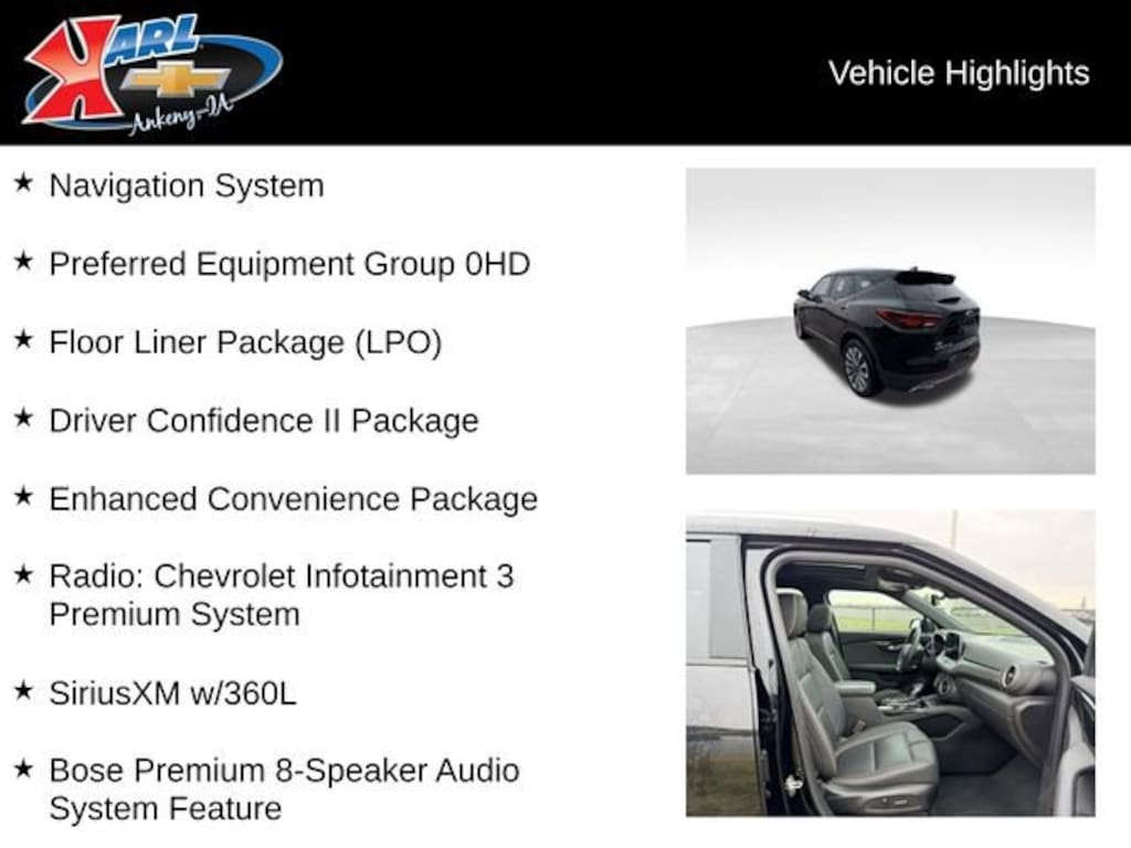At Karl Chevrolet we want to help you find the best new or used car in Ankeny that suits your needs. Check out the 2023 Chevrolet Blazer For Sale in Ankeny, IA. When you buy a new car at Karl Chevrolet you know you're finding a vehicle you can rely on. We have a great selection of Platinum Quality Pre-Owned Vehicles. We also pride ourselves in creating a friendly atmosphere and reliable new car dealership that you can trust. Call us with any questions about our 2023 Chevrolet Blazer and our experts will be glad to help you! (515) 299-4300. *Equipment and options are generated by a 3rd party vendor, exact vehicle options may vary. Please see a salesperson for complete details and vehicle information.