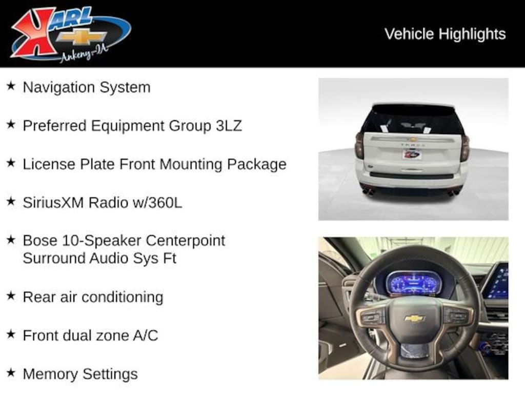 At Karl Chevrolet we want to help you find the best new or used car in Ankeny that suits your needs. Check out the 2023 Chevrolet Tahoe For Sale in Ankeny, IA. When you buy a new car at Karl Chevrolet you know you're finding a vehicle you can rely on. We have a great selection of Platinum Quality Pre-Owned Vehicles. We also pride ourselves in creating a friendly atmosphere and reliable new car dealership that you can trust. Call us with any questions about our 2023 Chevrolet Tahoe and our experts will be glad to help you! (515) 299-4300. *Equipment and options are generated by a 3rd party vendor, exact vehicle options may vary. Please see a salesperson for complete details and vehicle information.