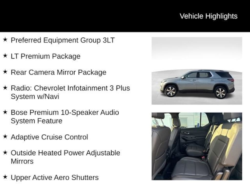 Certified.Sterling Gray Metallic LT Leather AWD 3.6L V6 SIDI VVT120-Volt Power Outlet, Adaptive Cruise Control, Bose Premium 10-Speaker Audio System Feature, Enhanced Automatic Emergency Braking, HD Surround Vision, Heated Driver & Front Passenger Seats, LT Premium Package, Outside Heated Power Adjustable Mirrors, Preferred Equipment Group 3LT, Radio: Chevrolet Infotainment 3 Plus System w/Navi, Rear Camera Mirror Package, Rear Camera Mirror Washer, Rear Pedestrian Alert, Upper Active Aero Shutters, Wheels: 20 Machined Face Aluminum.Here at Karl Chevrolet of Stuart we want to help you find the best vehicle to suit your needs. With our huge selection of new and pre-owned vehicles, we're sure to have the right car for you! We pride ourselves on creating a friendly buying experience and earning the title of Your Dealer for Life. Give us a call at 515.523.1201 and speak to our experts to find out just how easy it is to get the vehicle of your dreams!*Equipment and options are generated by a 3rd party vendor, exact vehicle options may vary. Please see a salesperson for complete details and vehicle information.Clean CARFAX. CARFAX One-Owner. Odometer is 19572 miles below market average!Certification Program Details: Karl Chevrolet of Stuart, your newest CarBravo dealer, where platinum quality vehicles and unmatched benefits come together! -Comprehensive Limited Bumper to Bumper Warranty. -24/7 Roadside Assistance: -Multi-Point Vehicle Inspection: Every vehicle undergoes a Platinum Quality Certified Inspection known throughout the industry to ensure top quality. -Vehicle Exchange Program. Within 10-Days and 500 miles -Complimentary Vehicle History Report -Nationwide Dealer Network Support: Enjoy the backing of the extensive CarBravo and GM dealership network. -OnStar and SiriusXM Trials: Enjoy connected services and entertainment with included trial subscriptions. -Terms and conditions may apply. With every vehicle purchased, you'll enjoy the peace of mind that comes with a limited warranty, 24/7 roadside assistance, and a comprehensive vehicle inspection.