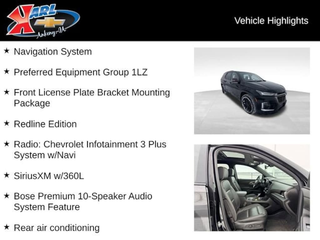 At Karl Chevrolet we want to help you find the best new or used car in Ankeny that suits your needs. Check out the 2023 Chevrolet Traverse For Sale in Ankeny, IA. When you buy a new car at Karl Chevrolet you know you're finding a vehicle you can rely on. We have a great selection of Platinum Quality Pre-Owned Vehicles. We also pride ourselves in creating a friendly atmosphere and reliable new car dealership that you can trust. Call us with any questions about our 2023 Chevrolet Traverse and our experts will be glad to help you! (515) 299-4300. *Equipment and options are generated by a 3rd party vendor, exact vehicle options may vary. Please see a salesperson for complete details and vehicle information.