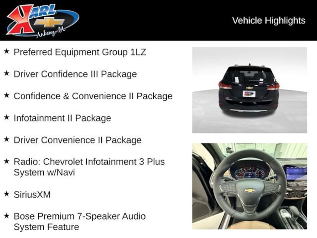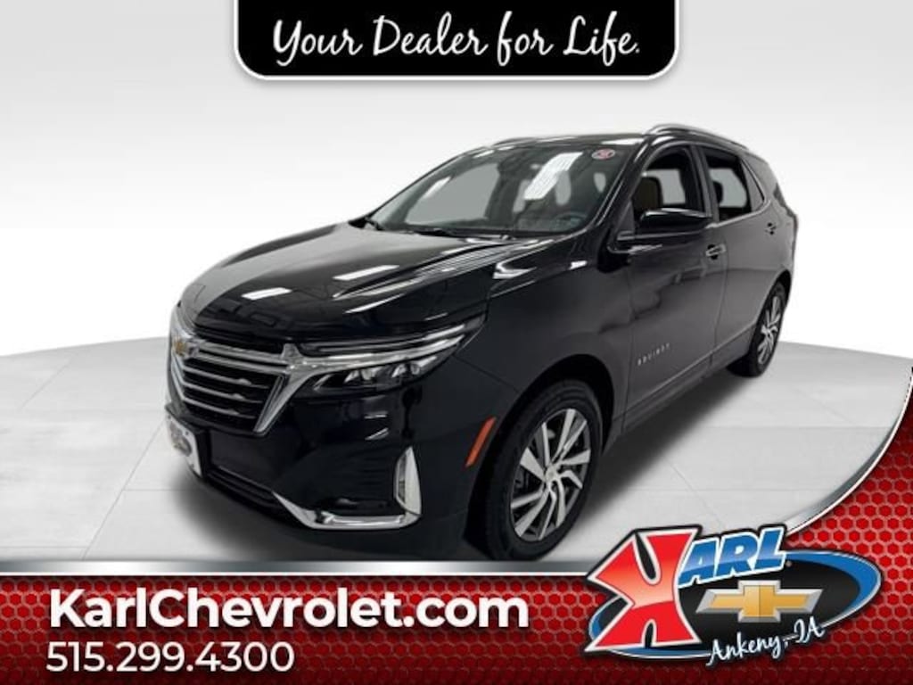 Certification Program Details: Karl Chevrolet of Ankeny, The Nation's #1 CarBravo Certified Dealer! Every CarBravo Certified vehicle includes: Comprehensive 126-Point Inspection Professionally inspected by factory-trained technicians to meet strict mechanical, safety, and cosmetic standards. 12-Month / 12,000-Mile Bumper-to-Bumper Limited Warranty Enjoy added peace of mind with extensive coverage from the day you drive off the lot. 24/7 Roadside Assistance & Courtesy Transportation Flat tire? Dead battery? Need a tow? You're covered anywhere, anytime throughout the warranty period. Vehicle History & Title Guarantee Clean title, completed safety recalls, and a full CARFAX® or AutoCheck® report provided for complete transparency. 10-Day / 500-Mile Exchange Promise If you don't absolutely love it, bring it back and exchange it no hassle, no stress. Experience peace of mind and premium protection exclusively from Karl Chevrolet of Ankeny, the Nation's #1 CarBravo Dealer!- Confidence & Convenience II Package- Driver Confidence III Package- Driver Convenience II Package- Infotainment II Package- Bose Premium 7-Speaker Audio System Feature- Radio: Chevrolet Infotainment 3 Plus System w/Navi- SiriusXM- Front dual zone A/C- Bluetooth® For Phone- Memory seat- Power driver seat- Power Sunroof- Auto High-beam Headlights- Adaptive Cruise ControlThis 2024 Chevrolet Equinox Premier AWD 4DR PREMIER is a remarkable SUV that combines style, comfort, and advanced technology. With its sleek black exterior and powerful 1.5L DOHC engine, this Equinox delivers an exceptional driving experience. The all-wheel-drive system ensures confident handling in all weather conditions, while the 6-speed automatic transmission with overdrive provides seamless acceleration and efficient performance.Inside, the Equinox Premier offers a premium cabin experience with perforated leather-appointed seats, heated and ventilated front seats, and a heated steering wheel. The Bose premium 7-speaker audio system and Chevrolet Infotainment 3 Plus system with connected navigation provide exceptional entertainment and connectivity. Safety features like automatic front and rear parking assist, HD surround vision, and adaptive cruise control further enhance the driving experience.As a CarBravo Certified vehicle, this Equinox has undergone a comprehensive 126-point inspection by our factory-trained technicians. It comes with a 12-month/12,000-mile bumper-to-bumper limited warranty, 24/7 roadside assistance, and a 10-day/500-mile exchange promise, giving you the peace of mind you deserve.At Karl Chevrolet, we are committed to providing our customers with exceptional vehicles and unparalleled service. Our knowledgeable sales team is ready to assist you in finding the perfect Equinox to meet your needs. Visit us today and experience the difference that Karl Chevrolet can make in your car-buying journey.At Karl Chevrolet we want to help you find the best new or used car in Ankeny that suits your needs. When you buy a new car at Karl Chevrolet you know you're finding a vehicle you can rely on. We have a great selection of Platinum Quality Pre-Owned Vehicles. We also pride ourselves in creating a friendly atmosphere and a reliable Dealership that you can trust. Call us and our experts will be glad to help you! (515) 299-4300. *Equipment and options are generated by a 3rd party vendor, exact vehicle options may vary. Please see a salesperson for complete details and vehicle information.