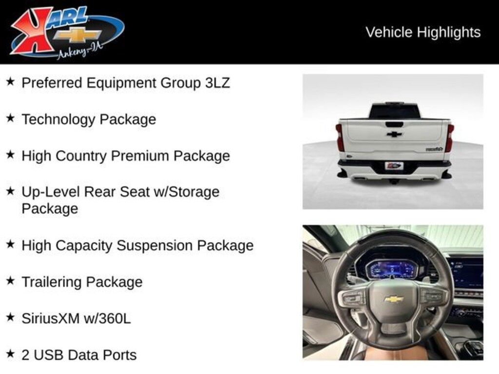 Recent Arrival! CARFAX One-Owner, Local Trade, Sold New at Karls & All Services Done at Karls! Equipped With Power Running Boards! Clean CARFAX. Certified. Iridescent Pearl Tricoat 2024 Chevrolet Silverado 1500 High Country 4WD CREW CAB 147 HIGH COUNTRY 3.0L I6 10-Speed Automatic, 4WD, Jet Black/Umber Leather, 12.3 Multicolor Reconfigurable Digital Display, 15 Diagonal Multicolor Head-Up Display, 2 USB Data Ports, 2nd Row Heated Outboard Seats, Adaptive Cruise Control, All-Weather Floor Liner (LPO), Auto High-beam Headlights, Auto-Dimming Inside Rear-View Mirror, Auto-Locking Rear Differential, Bed View Camera, Bluetooth® For Phone, Body-Color Painted Mirror Caps, Chevrolet Connected Access Capable, Chevytec Spray-On Black Bedliner, Chrome Assist Steps, Chrome Recovery Hooks, Color-Keyed Carpeting Floor Covering, Deep-Tinted Glass, Driver Memory, Dual Exhaust w/Polished Outlets, Dual Rear USB Ports (Charge Only), Electric Rear-Window Defogger, Electrical Steering Column Lock, EZ Lift Power Lock & Release Tailgate, Floor Mounted Center Console, Forward Collision Alert, Front Carpeted Floor Mats, Front dual zone A/C, Front LED Fog Lamps, Front Rain-Sensing Wipers, HD Surround Vision, Heated Driver & Front Outboard Passenger Seats, Heated Steering Wheel, High Capacity Suspension Package, High Country Premium Package, Hitch Guidance w/Hitch View, In-Vehicle Trailering System App, Integrated Trailer Brake Controller, Keyless Open & Start, Lane Keep Assist w/Lane Departure Warning, LED Cargo Area Lighting, Multi-Flex Tailgate, OnStar & Chevrolet Connected Services Capable, Outside Heated Power-Adjustable Mirrors, Perimeter Lighting, Power driver seat, Power Sliding Rear Window w/Rear Defogger, Power Sunroof, Power Tailgate, Power Tilt & Telescoping Steering Column, Power windows, Preferred Equipment Group 3LZ, Premium Bose 7-Speaker Sound System, Rain sensing wipers, Rear Camera Mirror, Rear Carpeted Floor Mats, Rear Cross Traffic Braking, Rear Pedestrian Alert, Rear Wheelhouse Liners, Remote Vehicle Starter System, Safety Alert Seat, SiriusXM w/360L, Standard Tailgate, Steering Wheel Audio Controls, Technology Package, Theft Deterrent System (Unauthorized Entry), Trailer Camera Provisions, Trailer Side Blind Zone Alert, Trailering Package, Ultrasonic Front & Rear Park Assist, Universal Home Remote, Up-Level Rear Seat w/Storage Package, Ventilated Driver & Front Passenger Seats, Wheels: 22 x 9 Painted Aluminum, Wi-Fi Hot Spot Capable, Wrapped Steering Wheel. 23/27 City/Highway MPG 10-Speed Automatic 4WDCertification Program Details: Karl Chevrolet of Ankeny, The Nation's #1 CarBravo certified dealer, where platinum quality vehicles and unmatched benefits come together! This vehicle qualifies for our CarBravo Certified program reserved for the highest-quality pre-owned vehicles that are 10 model years or newer and have less than 100,000 miles. Every CarBravo Certified vehicle includes: ? Comprehensive 126-Point Inspection Professionally inspected by factory-trained technicians to meet strict mechanical, safety, and cosmetic standards. ? 6-Month / 6,000-Mile Bumper-to-Bumper Limited Warranty Enjoy added peace of mind with extensive coverage from the day you drive off the lot. ? 24/7 Roadside Assistance & Courtesy Transportation Flat tire? Dead battery? Need a tow? You're covered anywhere, anytime throughout the warranty period. ? Vehicle History & Title Guarantee Clean title, completed safety recalls, and a full CARFAX® or AutoCheck® report provided for complete transparency. ? 10-Day / 500-Mile Exchange Promise If you don't absolutely love it, bring it back and exchange it no hassle, no stress. Experience peace of mind and premium protection exclusively from Karl Chevrolet of Ankeny, the Nation's #1 CarBravo Certified Deale