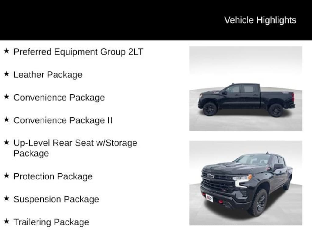 The Silverado's rugged good looks are complemented by a wealth of advanced features, including the Convenience Package II, which adds a range of driver-assistive technologies like Universal Home Remote, Rear Sliding Power Window, Hitch Guidance with Hitch View, and the Trailering App. The Leather Package elevates the interior with premium leather-appointed seating, while the Protection Package safeguards your investment with Chevytec spray-on bedliner and wheel house liners.