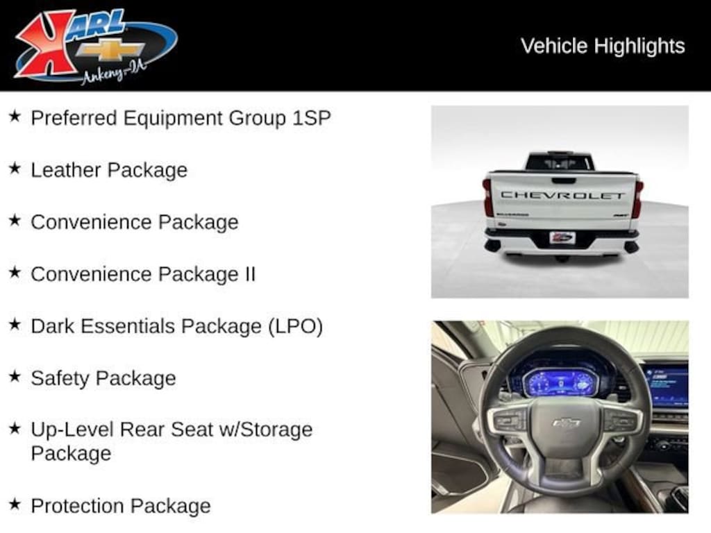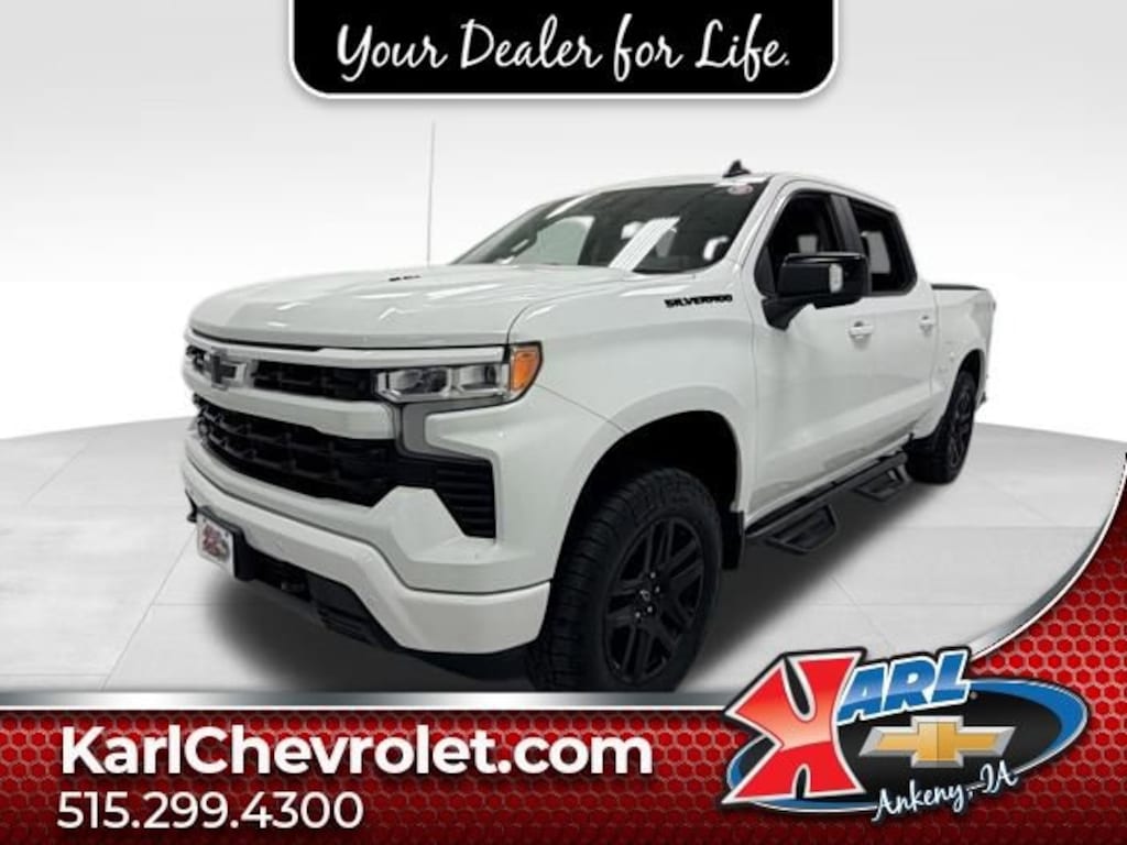Recent Arrival! CARFAX One-Owner, Local Trade & Sold New at Karls! Equipped With Running Boards, Bed Liner & Tonneau Cover! Certified. Summit White 2024 Chevrolet Silverado 1500 RST 4WD CREW CAB 147 RST EcoTec3 6.2L V8 10-Speed Automatic, 4WD, Black Leather, 10-Way Power Driver Seat w/Lumbar, 12.3 Multicolor Reconfigurable Digital Display, 6-Speaker Audio System, All-Star Edition, Auto High-beam Headlights, Auto-Locking Rear Differential, Black Name Plates (LPO), Black Tailgate CHEVROLET Lettering (LPO), Bluetooth® For Phone, Chevrolet Connected Access Capable, Color-Keyed Carpeting Floor Covering, Convenience Package, Convenience Package II, Dark Essentials Package (LPO), Deep-Tinted Glass, Dual Rear USB Ports (Charge Only), Dual-Zone Automatic Climate Control, Electric Rear-Window Defogger, Electrical Steering Column Lock, Electronic Cruise Control, EZ Lift Power Lock & Release Tailgate, Forward Collision Alert, Front Frame-Mounted Black Recovery Hooks, Front LED Fog Lamps, Front Rubberized Vinyl Floor Mats, HD Rear Vision Camera, HD Surround Vision, Heated Driver & Front Outboard Passenger Seats, Heated Power-Adjustable Outside Mirrors, Heated Steering Wheel, High Capacity Suspension Package, High Gloss Black Mirror Caps, Hitch Guidance w/Hitch View, In-Vehicle Trailering System App, Inside Rear-View Mirror w/Tilt, Integrated Trailer Brake Controller, Keyless Open & Start, Lane Keep Assist w/Lane Departure Warning, Leather Package, Leather-Appointed Front Seat Trim, LED Cargo Area Lighting, OnStar & Chevrolet Connected Services Capable, Perimeter Lighting, Power Front Windows w/ Express Up/Down, Power Rear Windows w/Express Down, Power Sliding Rear Window w/Rear Defogger, Power Sunroof, Preferred Equipment Group 1SP, Premium Bose 7-Speaker Sound System, Protection Package, Rear 60/40 Folding Bench Seat, Rear Cross Traffic Braking, Rear Pedestrian Alert, Rear Rubberized-Vinyl Floor Mats, Rear Wheelhouse Liners, Remote Vehicle Starter System, Safety Package, SiriusXM w/360L, Standard Suspension Package, Standard Tailgate, Steering Wheel Audio Controls, Theft Deterrent System (Unauthorized Entry), Trailer Camera Provisions, Trailer Side Blind Zone Alert, Trailering Package, Ultrasonic Front & Rear Park Assist, Universal Home Remote, Up-Level Rear Seat w/Storage Package, Wheels: 20 x 9 High Gloss Black Painted Alum, Wi-Fi Hot Spot Capable, Wrapped Steering Wheel. 15/20 City/Highway MPG 10-Speed Automatic 4WD
