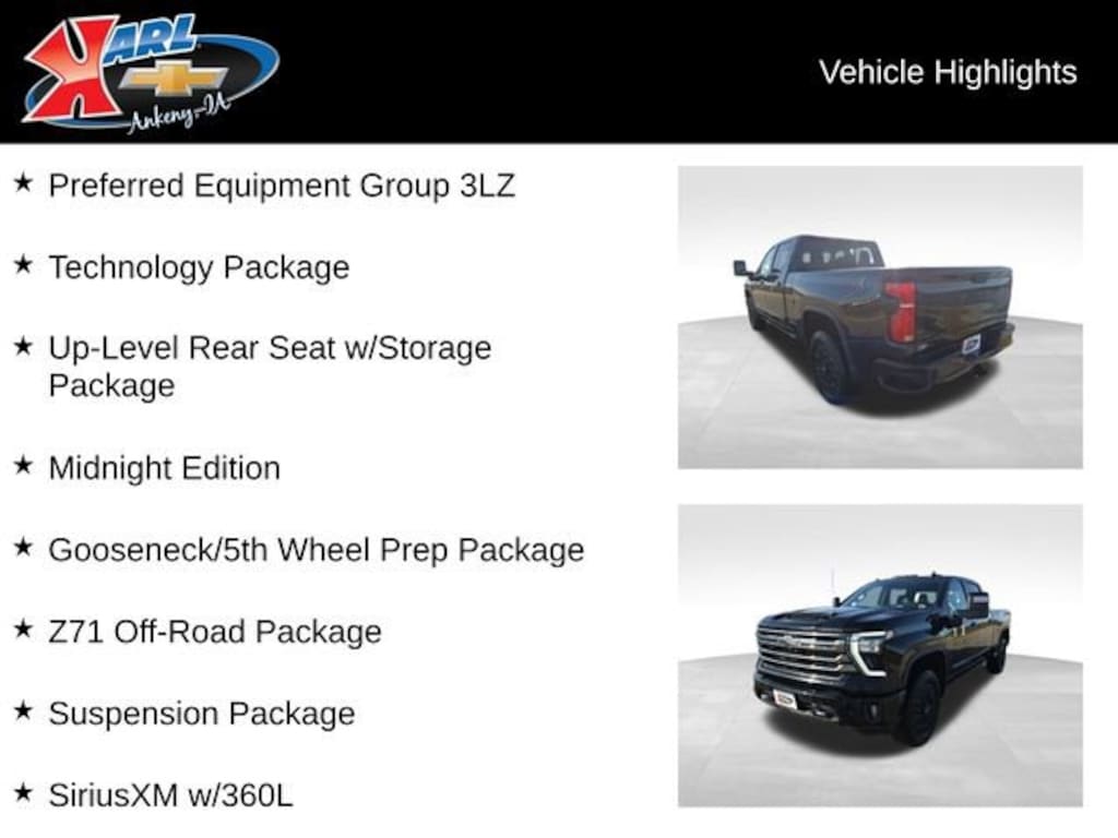 Recent Arrival! CARFAX One Owner, Local Trade & Sold New at Karls! Clean CARFAX. Certified. Black 2024 Chevrolet Silverado 2500HD High Country 4WD CREW 159 Duramax 6.6L V8 Turbodiesel 10-Speed Automatic, 4WD, Jet Black Leather, 15 Diagonal Multicolor Head-Up Display, 170 Amp Alternator, 6 Rectangular Chromed Tubular Assist Steps, Adaptive Cruise Control, Apple CarPlay/Android Auto, Auto High-beam Headlights, Auto-Dimming Inside Rear-View Mirror, Bed View Camera w/2 Trailer Camera Provisions, Black Beltline Moldings, Black Chevytec Spray-On Bedliner, Bluetooth® For Phone, Body-Color Front Bumper, Body-Color Mirror Caps, Body-Color Rear Bumper, BOSE Premium 7-Speaker Sound System, Chevrolet Connected Access Capable, Chrome Door Handles, Chrome Mirror Caps, Color-Keyed Carpeting Floor Covering, Compass, Deep-Tinted Glass, Driver Memory, Electric Rear-Window Defogger, Electronic Cruise Control w/Set & Resume Speed, Front Carpeted Floor Mats, Front Chrome Recovery Hooks, Front dual zone A/C, Front LED Fog Lamps, Front Rain-Sensing Wipers, Gooseneck/5th Wheel Prep Package, Heated 2nd Row Outboard Seats, Heated Driver & Front Outboard Passenger Seating, Heated Steering Wheel, High Gloss Black Door Handles, Hill Descent Control, Hitch Guidance w/Hitch View, In-Vehicle Trailering App System, Keyless Open & Start, LED Cargo Area Lighting, Manual Tilt & Telescoping Steering Column, Midnight Edition, Off-Road Suspension, OnStar & Chevrolet Connected Services Capable, Polished Exhaust Tip, Power Door Locks, Power driver seat, Power Sliding Rear Window w/Defogger, Power windows, Power-Retractable Black Assist Steps, Preferred Equipment Group 3LZ, Push Button Start, Pwr Up/Down Tailgate Function w/Pwr Lock & Release, Rear Camera Mirror, Rear Carpeted Floor Mats, Rear Cross Traffic Alert, Rear Wheelhouse Liners, Remote Vehicle Starter System, SiriusXM w/360L, Steering Wheel Audio Controls, Suspension Package, Technology Package, Trailer Camera Provisions, Ultrasonic Front & Rear Park Assist, Unauthorized Entry Theft-Deterrent System, Universal Home Remote, Up-Level Rear Seat w/Storage Package, Ventilated Driver & Front Passenger Seats, Wheels: 20 High Gloss Blk Paint w/Blk Center Caps, Wi-Fi Hotspot Capable, Wireless Charging, Wireless Phone Projection, Wrapped Steering Wheel, Z71 Off-Road Package. 10-Speed Automatic 4WD