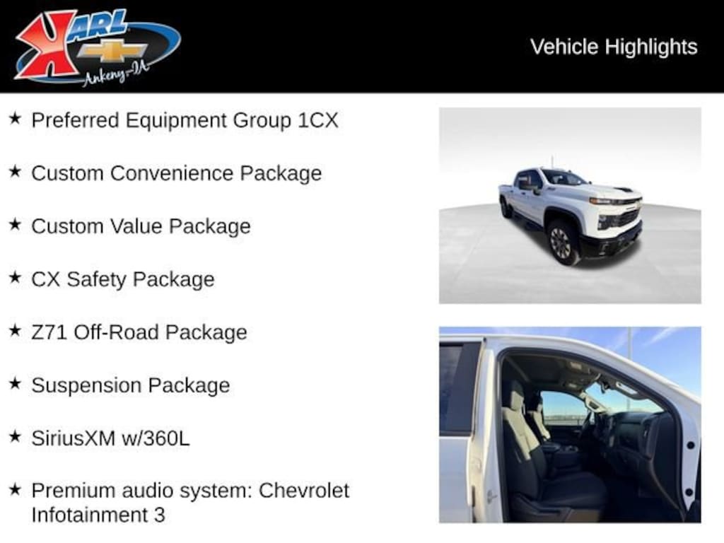 At Karl Chevrolet, we're committed to providing our customers with an exceptional vehicle-buying experience. Our expert team is ready to help you find the perfect Silverado 2500HD to meet your needs. Call us today at (515) 299-4300 to schedule a test drive and experience the power, capability, and premium features of this exceptional truck. *Equipment and options are generated by a 3rd party vendor, exact vehicle options may vary. Please see a salesperson for complete details and vehicle information.