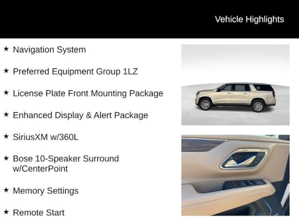 12-Way Power Driver & Passenger Seat Adjusters, 15 Diagonal Multi-Color Head-Up Display, 1st & 2nd Row Color-Keyed Carpeted Floor Mats, 2-Speed Active Electronic AutoTrac Transfer Case, 3rd Row 60/40 Power-Folding Split-Bench, Auto-Dimming Inside Rear-View Mirror, Bose 10-Speaker Surround w/CenterPoint, Bright Front & Rear Door Sill Plates, Chrome Door Handles w/Body-Color Strip, Chrome Mirror Caps, Color-Keyed Carpeting Floor Covering, Driver & Front Outboard Passenger Airbags, Dual Exhaust System, Enhanced Display & Alert Package, Enhanced Driver Information Center, Floor Console, Hands-Free Rear Power Programmable Liftgate, HD Surround Vision, Heated 2nd Row Outboard Seats, Heated Driver & Front Passenger Seats, Heated Steering Wheel, Hill Descent Control, Infotainment Display, Inside Rearview Auto-Dimming Rear Camera Mirror, Lane Change Alert w/Side Blind Zone Alert, LED Daytime Running Lamps, License Plate Front Mounting Package, Memory Settings, Navigation System, Outside Heated Power-Adjustable Mirrors, Perforated Heated & Ventilated Seats, Power Release 2nd Row Bucket Seats, Power Tilt & Telescopic Steering Column, Preferred Equipment Group 1LZ, Rear Camera Mirror Washer, Rear Cross Traffic Alert, Rear Pedestrian Alert, Remote Start, Safety Alert Seat, SiriusXM w/360L, Universal Home Remote, Wireless Charging, Wrapped Steering Wheel.