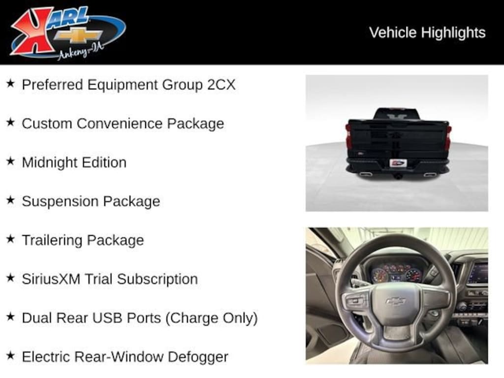 At Karl Chevrolet we want to help you find the best new or used car in Ankeny that suits your needs. Check out the 2025 Chevrolet Silverado 1500 For Sale in Ankeny, IA. When you buy a new car at Karl Chevrolet you know you're finding a vehicle you can rely on. We have a great selection of Platinum Quality Pre-Owned Vehicles. We also pride ourselves in creating a friendly atmosphere and reliable new car dealership that you can trust. Call us with any questions about our 2025 Chevrolet Silverado 1500 and our experts will be glad to help you! (515) 299-4300. *Equipment and options are generated by a 3rd party vendor, exact vehicle options may vary. Please see a salesperson for complete details and vehicle information.