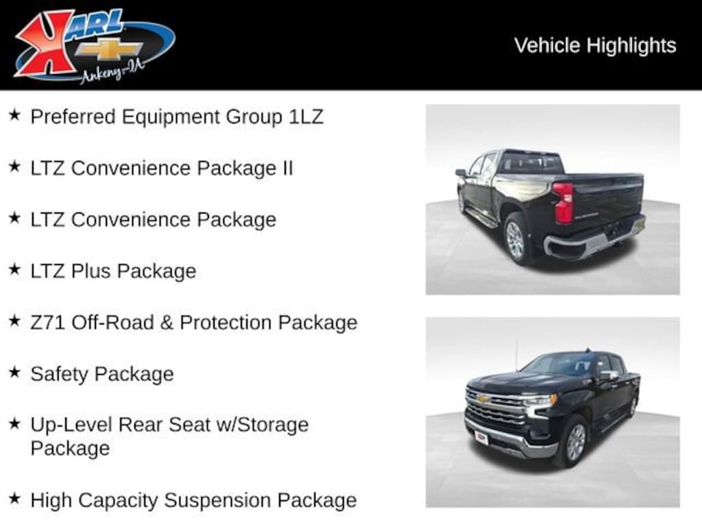 At Karl Chevrolet we want to help you find the best new or used car in Ankeny that suits your needs. When you buy a new car at Karl Chevrolet you know you're finding a vehicle you can rely on. We have a great selection of Platinum Quality Pre-Owned Vehicles. We also pride ourselves in creating a friendly atmosphere and a reliable Dealership that you can trust. Call us and our experts will be glad to help you! (515) 299-4300. *Equipment and options are generated by a 3rd party vendor, exact vehicle options may vary. Please see a salesperson for complete details and vehicle information.