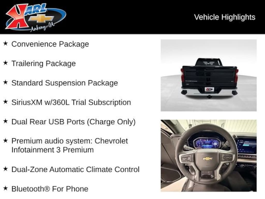 At Karl Chevrolet we want to help you find the best new or used car in Ankeny that suits your needs. When you buy a new car at Karl Chevrolet you know you're finding a vehicle you can rely on. We have a great selection of Platinum Quality Pre-Owned Vehicles. We also pride ourselves in creating a friendly atmosphere and a reliable Dealership that you can trust. Call us and our experts will be glad to help you! (515) 299-4300. *Equipment and options are generated by a 3rd party vendor, exact vehicle options may vary. Please see a salesperson for complete details and vehicle information.
