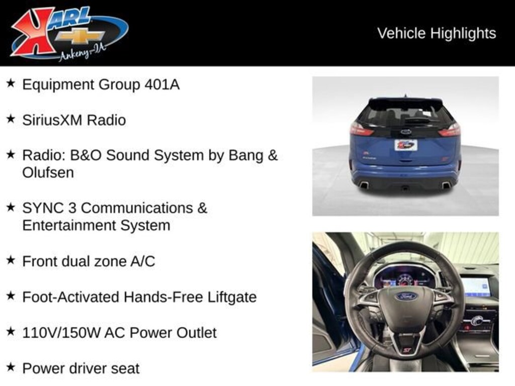 At Karl Chevrolet we want to help you find the best new or used car in Ankeny that suits your needs. Check out the 2019 Ford Edge For Sale in Ankeny, IA. When you buy a new car at Karl Chevrolet you know you're finding a vehicle you can rely on. We have a great selection of Platinum Quality Pre-Owned Vehicles. We also pride ourselves in creating a friendly atmosphere and reliable new car dealership that you can trust. Call us with any questions about our 2019 Ford Edge and our experts will be glad to help you! (515) 299-4300. *Equipment and options are generated by a 3rd party vendor, exact vehicle options may vary. Please see a salesperson for complete details and vehicle information.