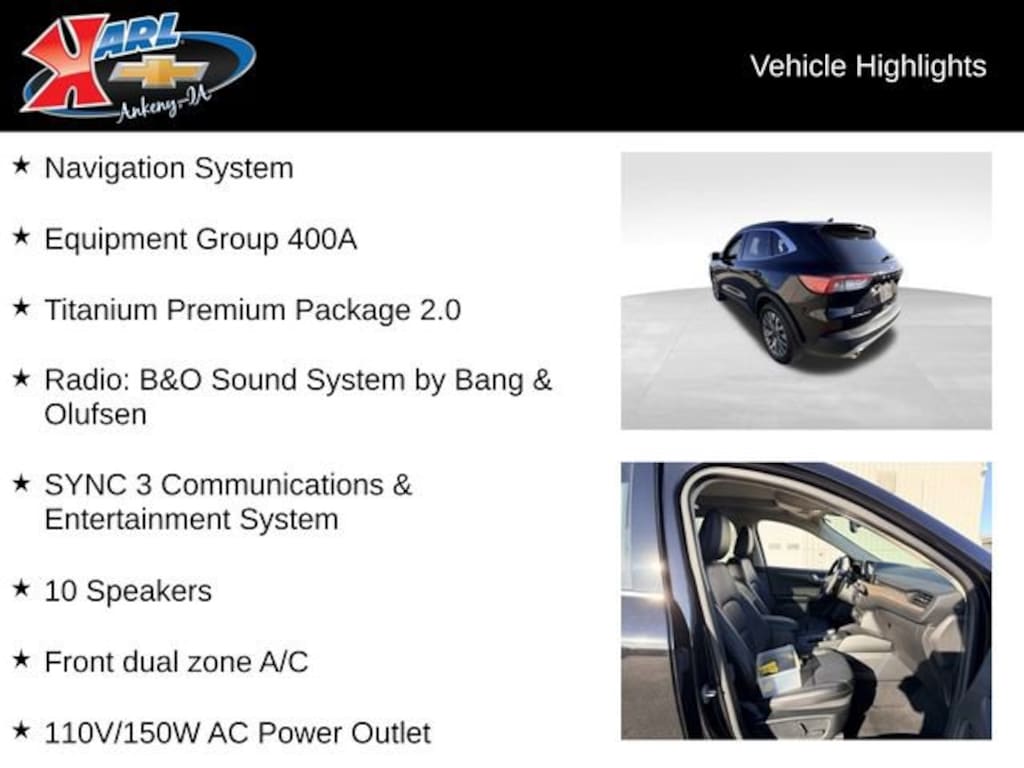 At Karl Chevrolet we want to help you find the best new or used car in Ankeny that suits your needs. Check out the 2020 Ford Escape For Sale in Ankeny, IA. When you buy a new car at Karl Chevrolet you know you're finding a vehicle you can rely on. We have a great selection of Platinum Quality Pre-Owned Vehicles. We also pride ourselves in creating a friendly atmosphere and reliable new car dealership that you can trust. Call us with any questions about our 2020 Ford Escape and our experts will be glad to help you! (515) 299-4300. *Equipment and options are generated by a 3rd party vendor, exact vehicle options may vary. Please see a salesperson for complete details and vehicle information.