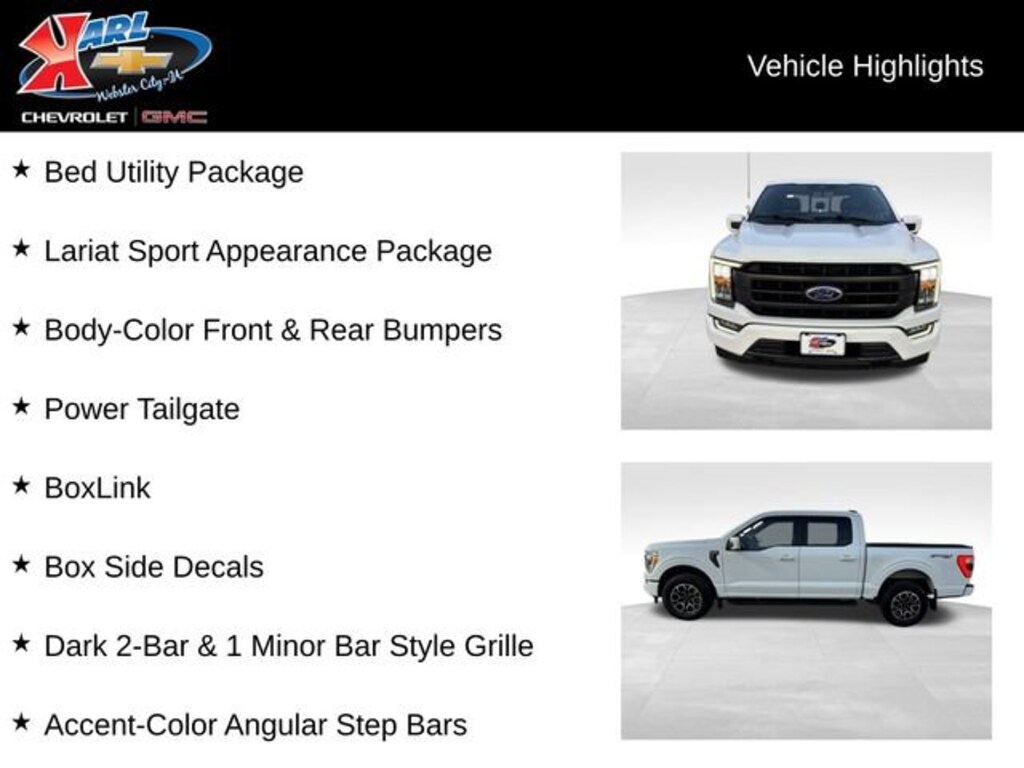 Clean CARFAX. Certified. 2023 Ford 4WD Oxford White 10-Speed Automatic 3.5L V6 EcoBoost 4WD, Accent-Color Angular Step Bars, Bed Utility Package, Body-Color Front & Rear Bumpers, Box Side Decals, BoxLink, Chrome Single-Tip Exhaust, Dark 2-Bar & 1 Minor Bar Style Grille, Extended Range 36 Gallon Fuel Tank, Lariat Sport Appearance Package, LED Box Lighting, Power Tailgate, Tailgate Step w/Tailgate Work Surface, Ventilated front seats, Wireless Charging Pad.
