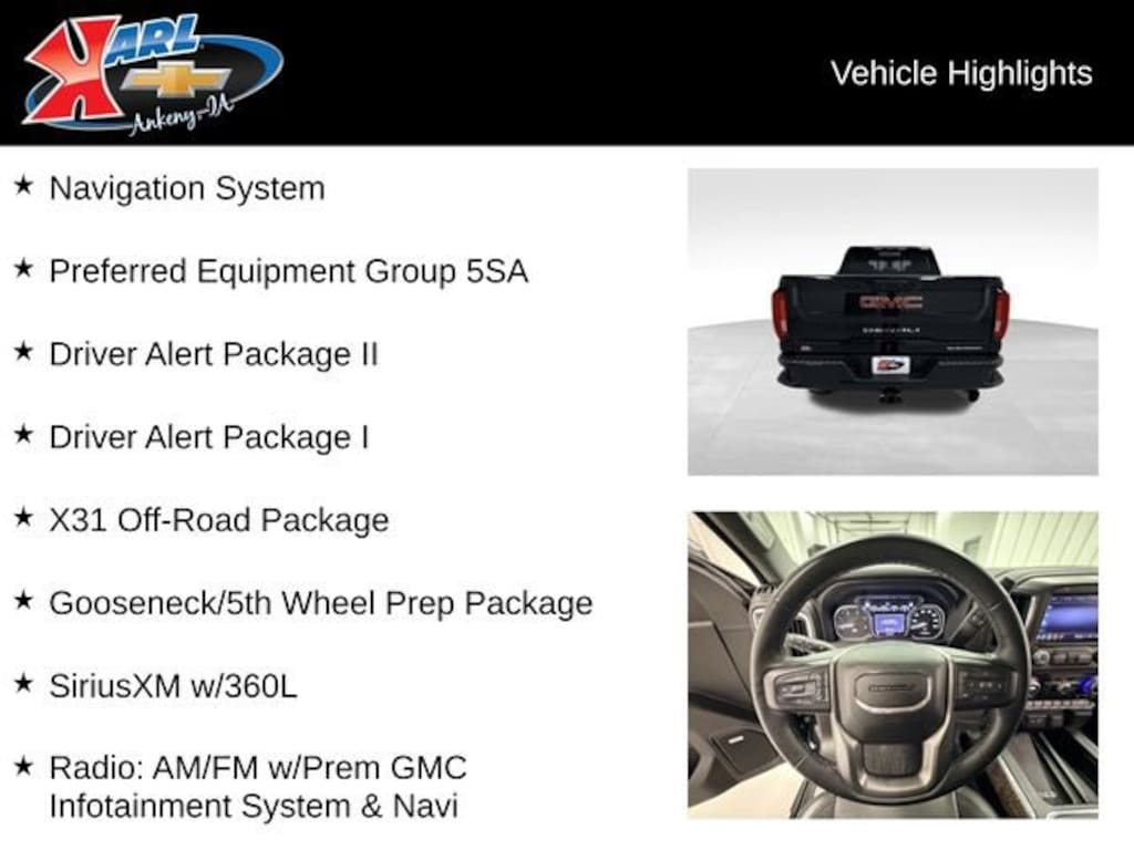 This exceptional 2023 GMC Sierra 2500HD Denali is now available at Karl Chevrolet of Ankeny, the Nation's #1 CarBravo Certified Dealer. Our rigorous 126-point inspection and 12-month/12,000-mile bumper-to-bumper warranty ensure you're getting a vehicle you can trust. With 24/7 roadside assistance, a vehicle history guarantee, and a 10-day/500-mile exchange promise, you can drive with confidence knowing you're backed by the best in the business.