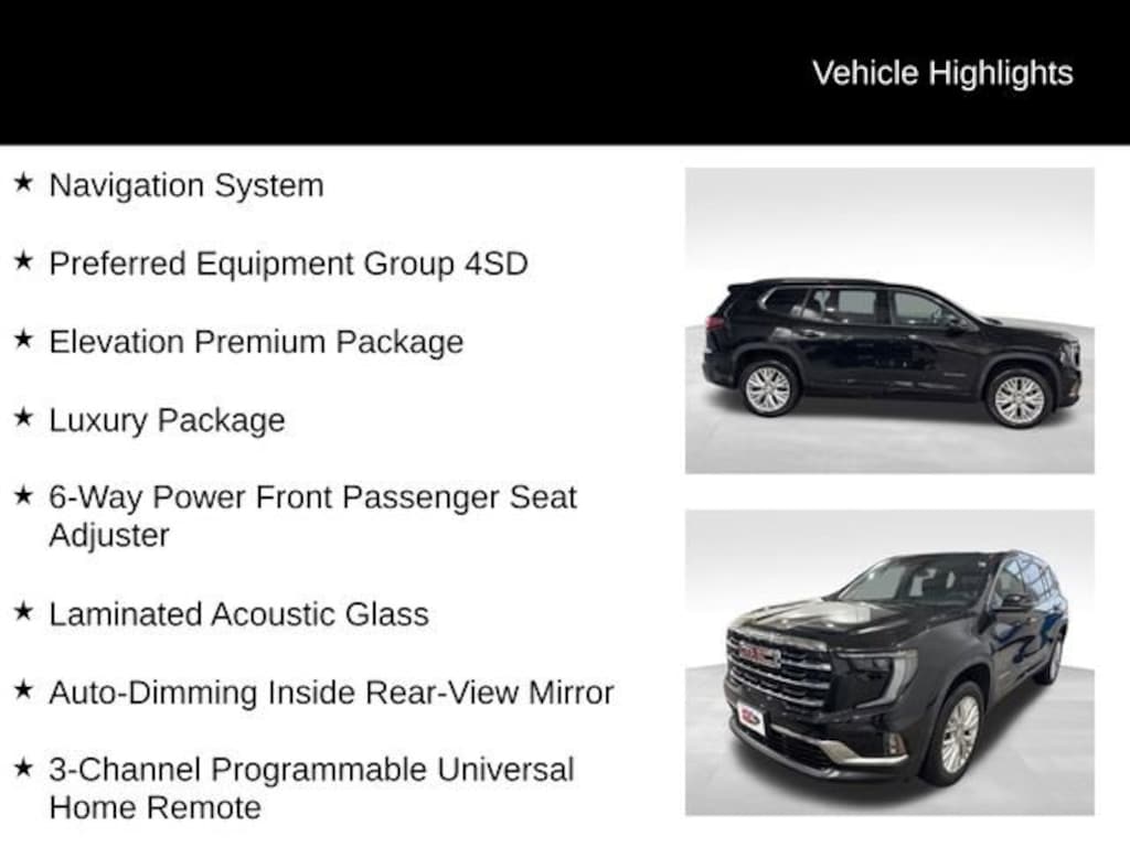 Elevate Your Driving Experience with the 2025 GMC Acadia ElevationCertification Program Details: Karl Chevrolet Stuart, CarBravo Certified Dealer! Every CarBravo Certified vehicle includes: Comprehensive 126-Point Inspection Professionally inspected by factory-trained technicians to meet strict mechanical, safety, and cosmetic standards. 12-Month / 12,000-Mile Bumper-to-Bumper Limited Warranty Enjoy added peace of mind with extensive coverage from the day you drive off the lot. 24/7 Roadside Assistance & Courtesy Transportation Flat tire? Dead battery? Need a tow? You're covered anywhere, anytime throughout the warranty period. Vehicle History & Title Guarantee Clean title, completed safety recalls, and a full CARFAX® or AutoCheck® report provided for complete transparency. 10-Day / 500-Mile Exchange Promise If you don't absolutely love it, bring it back and exchange it no hassle, no stress. Experience peace of mind and premium protection exclusively from Karl Chevrolet Stuart!!- Sunroof, Power, Panoramic Sunroof with Sunshade- Elevation Premium Package- Luxury Package- Preferred Equipment Group 4SD- 6-Way Power Front Passenger Seat Adjuster- 3-Channel Programmable Universal Home Remote- 8 Diagonal Head-Up Display- Auto-Dimming Inside Rear-View Mirror- Navigation System- 7-Passenger Seating (2-2-3 Seating Configuration)- CoreTec Seat Trim- Front Passenger Power Lumbar Seat Adjuster- Heated Rear Outboard Seating Positions- Laminated Acoustic Glass- Wheels: 20 x 8 Bright Silver Aluminum- Heated Wiper ParkThis 2025 GMC Acadia Elevation is the perfect blend of style, capability, and convenience. With its sleek Ebony Twilight Metallic exterior and premium Elevation features, this SUV commands attention on the road. The powerful 2.5L DOHC engine, paired with an 8-speed automatic transmission and available All-Wheel Drive, delivers a smooth and responsive driving experience.Inside, the spacious cabin offers seating for up to seven passengers, with premium CoreTec upholstery and a host of comfort-enhancing features. The panoramic sunroof floods the interior with natural light, while the 8-inch Head-Up Display and advanced infotainment system keep you connected and informed. Enjoy the convenience of heated front and rear seats, a heated steering wheel, and a power liftgate for effortless loading and unloading.Certified through the Karl Chevrolet Stuart CarBravo program, this Acadia Elevation has undergone a rigorous 126-point inspection and comes with a 12-month/12,000-mile limited warranty, 24/7 roadside assistance, and a vehicle history report for complete transparency. Experience the confidence and peace of mind that comes with a CarBravo Certified vehicle.At Karl Chevrolet Stuart we want to help you find the best new or used car in Stuart that suits your needs. When you buy a new car at Karl Chevrolet Stuart you know you're finding a vehicle you can rely on. We have a great selection of CarBravo Quality Pre-Owned Vehicles. We also pride ourselves in creating a friendly atmosphere and a reliable Dealership that you can trust. Call us and our experts will be glad to help you! (515) 523-1201. *Equipment and options are generated by a 3rd party vendor, exact vehicle options may vary. Please see a salesperson for complete details and vehicle information.