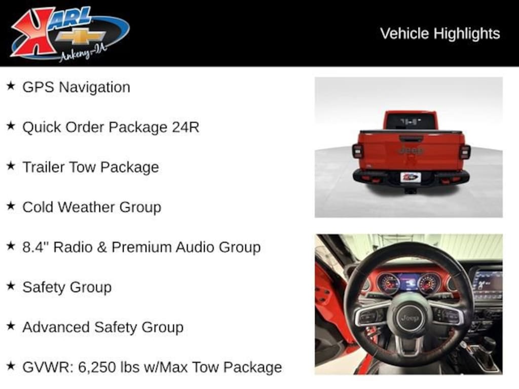 At Karl Chevrolet we want to help you find the best new or used car in Ankeny that suits your needs. Check out the 2021 Jeep Gladiator For Sale in Ankeny, IA. When you buy a new car at Karl Chevrolet you know you're finding a vehicle you can rely on. We have a great selection of Platinum Quality Pre-Owned Vehicles. We also pride ourselves in creating a friendly atmosphere and reliable new car dealership that you can trust. Call us with any questions about our 2021 Jeep Gladiator and our experts will be glad to help you! (515) 299-4300. *Equipment and options are generated by a 3rd party vendor, exact vehicle options may vary. Please see a salesperson for complete details and vehicle information.