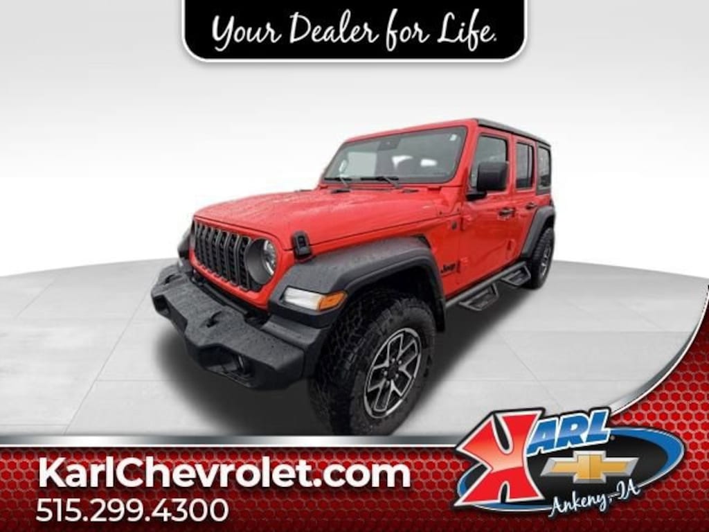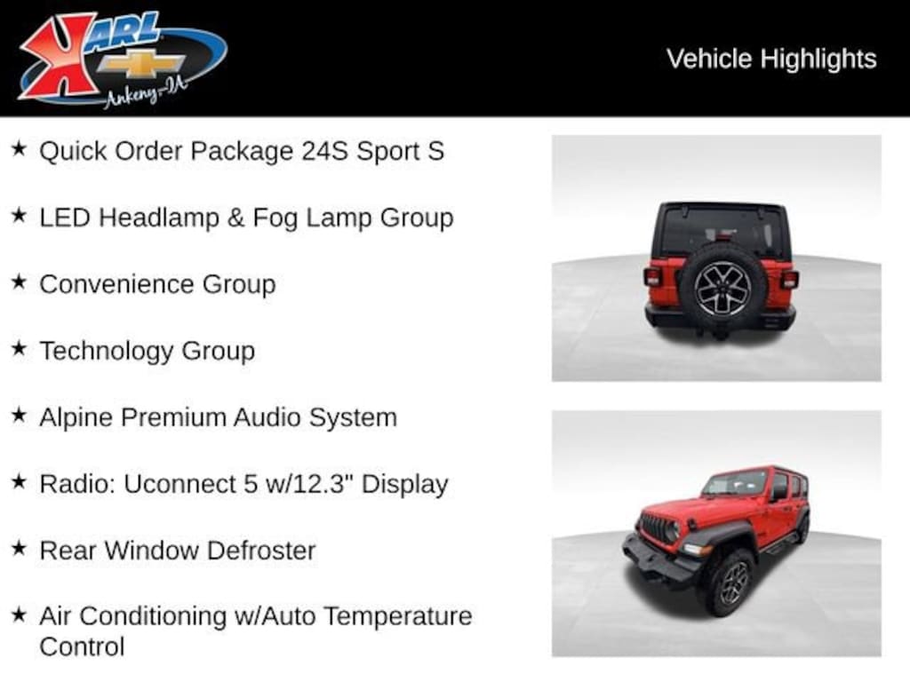 Recent Arrival! CARFAX One-Owner, Local Trade, Sold New at Karls & All Services Done at Karls! Equipped With Running Boards! Clean CARFAX. Certified. Firecracker Red Clearcoat 2024 Jeep Wrangler Sport S SPORT S 4 DOOR 4X4 3.6L V6 24V VVT 2-Door Passive Entry, Front Door Locks, 240 Amp Alternator, Advanced Brake Assist, Air Conditioning w/Auto Temperature Control, Air Filtering, Alpine Premium Audio System, Apple CarPlay/Android Auto, Automatic Headlamps, Black 3-Piece Hard Top, Cluster 7.0 TFT Color Display, Convenience Group, Corning Gorilla Glass, Deep Tint Sunscreen Windows, Emergency/Assistance Call, Enhanced Adaptive Cruise Control, Freedom Panel Storage Bag, Front 1-Touch Down Power Windows, Front LED Fog Lamps, Full Speed Forward Collision Warning Plus, Heated Front Seats, Heated Steering Wheel, LED Headlamp & Fog Lamp Group, LED Premium Reflector Headlamps, MOPAR Hardtop Headliner, No Soft Top, ParkView Rear Back-Up Camera, Power Heated Mirrors, Premium Wrapped Steering Wheel, Quick Order Package 24S Sport S, Radio: Uconnect 5 w/12.3 Display, Rear Window Defroster, Rear Window Wiper/Washer, Remote Keyless Entry, Remote Start System, Security Alarm, Speed Sensitive Power Locks, Sport S, Sun Visors w/Illuminated Vanity Mirrors, Technology Group, Universal Garage Door Opener, Wheels: 17 x 7.5 Gray. 18/23 City/Highway MPG 8-Speed Automatic 4WDAt Karl Chevrolet we want to help you find the best new or used car in Ankeny that suits your needs. Check out the 2024 Jeep Wrangler For Sale in Ankeny, IA. When you buy a new car at Karl Chevrolet you know you're finding a vehicle you can rely on. We have a great selection of Platinum Quality Pre-Owned Vehicles. We also pride ourselves in creating a friendly atmosphere and reliable new car dealership that you can trust. Call us with any questions about our 2024 Jeep Wrangler and our experts will be glad to help you! (515) 299-4300. *Equipment and options are generated by a 3rd party vendor, exact vehicle options may vary. Please see a salesperson for complete details and vehicle information.Certification Program Details: Karl Chevrolet of Ankeny, your newest CarBravo dealer, where platinum quality vehicles and unmatched benefits come together! -Comprehensive Limited Bumper to Bumper Warranty. -24/7 Roadside Assistance: -Multi-Point Vehicle Inspection: Every vehicle undergoes a Platinum Quality Certified Inspection known throughout the industry to ensure top quality. -Vehicle Exchange Program. Within 10-Days and 500 miles -Complimentary Vehicle History Report -Nationwide Dealer Network Support: Enjoy the backing of the extensive CarBravo and GM dealership network. -OnStar and SiriusXM Trials: Enjoy connected services and entertainment with included trial subscriptions. -Terms and conditions may apply. With every vehicle purchased, you'll enjoy the peace of mind that comes with a limited warranty, 24/7 roadside assistance, and a comprehensive vehicle inspection.