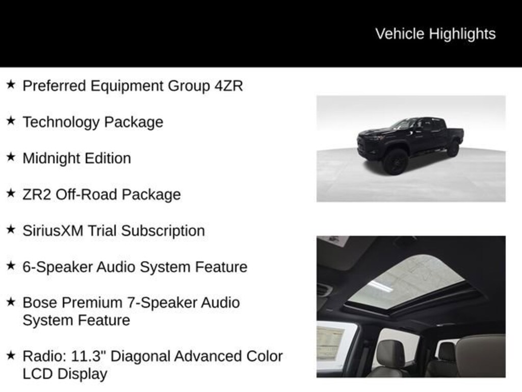 Factory MSRP: $58,570 $4,643 off MSRP! 4-Way Manual Passenger Seat Adjuster, 40 Off-Road Roof Light Bar (LPO), 6 Speakers, 6-Speaker Audio System Feature, Adaptive Cruise Control, Air Conditioning, AM/FM radio: SiriusXM, Apple CarPlay/Android Auto, Automatic Emergency Braking, Automatic temperature control, Bed-Mounted Sport Bar w/Sail Panel (LPO), Black Nameplates (LPO), Bose Premium 7-Speaker Audio System Feature, Brake assist, Chevy Safety Assist, Driver & Front Passenger Ventilated Seats, Dual front side impact airbags, Electronic Stability Control, Following Distance Indicator, Forward Collision Alert, Front Bucket Seats, Front Center Armrest, Front dual zone A/C, Front Pedestrian & Bicyclist Braking, HD Surround Vision, Heated Driver & Front Passenger Seats, Heated front seats, Heated steering wheel, Illuminated entry, IntelliBeam Automatic High Beam On/Off, Lane Keep Assist w/Lane Departure Warning, Low tire pressure warning, Midnight Edition, Outside temperature display, Perforated Leather-Appointed Seat Trim, Power driver seat, Power Sliding Glass w/Manual Shade Sunroof, Power steering, Preferred Equipment Group 4ZR, Radio: 11.3 Diagonal Advanced Color LCD Display, Rear Pedestrian Alert, Rear reading lights, Rear window defroster, Remote keyless entry, Removable Front & Rear Off-Road Assist Steps (LPO), SiriusXM Trial Subscription, Steering Wheel Mounted Audio Controls, Steering wheel mounted audio controls, Tachometer, Technology Package, Ventilated front seats, Wheels: 17 x 8 High Gloss Black Painted Aluminum, Wireless Phone Projection, ZR2 Off-Road Package.Recent Arrival!Black 2025 Chevrolet Colorado 4D Crew Cab ZR2 2.7L I4 Turbocharged DOHC 16V LEV3-ULEV50 310hp 17/17 City/Highway MPG 8-Speed Automatic 4WDHere at Karl Chevrolet of Stuart we want to help you find the best vehicle to suit your needs. With our huge selection of new and pre-owned vehicles, we're sure to have the right car for you! We pride ourselves on creating a friendly buying experience and earning the title of Your Dealer for Life. Give us a call at 515.523.1201 and speak to our experts to find out just how easy it is to get the vehicle of your dreams! Price includes: $500 - Chevrolet Consumer Cash Program. Exp. 12/01/2025