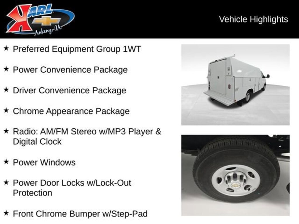 Factory MSRP: $42,790 Chrome Appearance Package, Chrome Grille, Driver & Front Passenger High-Back Bucket Seats, Driver Convenience Package, Driver's Seat Mounted Armrest, Engine Cover Console w/Swing-Out Storage Bin, Front Bucket Seats, Front Chrome Bumper w/Step-Pad, Power Convenience Package, Power Door Locks w/Lock-Out Protection, Power Windows, Preferred Equipment Group 1WT, Radio: AM/FM Stereo w/MP3 Player & Digital Clock, Reclining High-Back Bucket Seats w/Inboard Armrests, Tilt Steering Wheel, Vinyl Seat Trim, Wheels: 16 x 6.5 8-Lug Painted Steel HD (4).Recent Arrival!Summit White 2025 Chevrolet Express 3500 Work Van In-Transit 2D Chassis 6.6L V8 8-Speed Automatic RWDThe dealer has added these accessories to this vehicle:- UPFIT ($18,150) UPFIT Price includes $18,150 dealer added accessories.