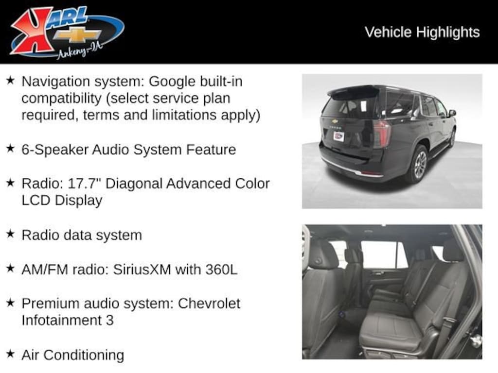 Factory MSRP: $65,945 $3,501 off MSRP! 4WD, Black Cloth, 1st & 2nd Row Color-Keyed Carpeted Floor Mats, 2-Way Power Driver Lumbar Seat Adjuster, 2-Way Power Front Passenger Lumbar Seat Adjuster, 3rd Row Manual 60/40 Split-Folding Bench Seats, 3rd row seats: split-bench, 6-Speaker Audio System Feature, 8-Way Power Driver Seat Adjuster, Air Conditioning, AM/FM radio: SiriusXM with 360L, Brake assist, Color-Keyed Carpeting Floor Covering, Compass, Delay-off headlights, Driver & Front Outboard Passenger Airbags, Dual front impact airbags, Dual front side impact airbags, Electronic Stability Control, Exterior Parking Camera Rear, Front 40/20/40 Split-Bench Seat, Front Bucket Seats, Front Center Armrest, Front dual zone A/C, Navigation system: Google built-in compatibility (select service plan required, terms and limitations apply), Occupant sensing airbag, Overhead airbag, Overhead console, Passenger vanity mirror, Power steering, Power windows, Premium audio system: Chevrolet Infotainment 3, Radio data system, Radio: 17.7 Diagonal Advanced Color LCD Display, Rain sensing wipers, Rear air conditioning, Rear reading lights, Rear window wiper, Remote keyless entry, Wheels: 18 x 8.5 Bright Silver Painted Aluminum, Wheels: 20 x 9 Machined Aluminum.