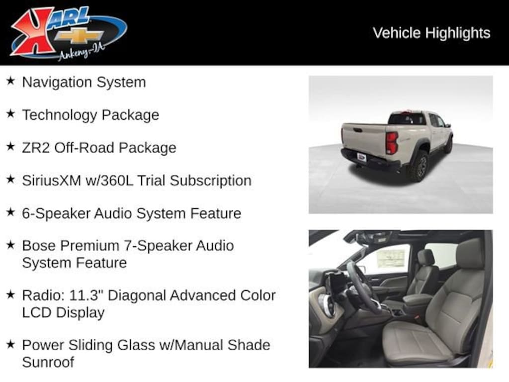 Factory MSRP: $55,120 $2,255 off MSRP! 4WD, 4-Way Manual Passenger Seat Adjuster, 6-Speaker Audio System Feature, Adaptive Cruise Control, Apple CarPlay/Android Auto, Bose Premium 7-Speaker Audio System Feature, Driver & Front Passenger Heated Seats, Driver & Front Passenger Ventilated Seats, Driver Memory Settings, Front Bucket Seats, Front Center Armrest, HD Surround Vision, Heated door mirrors, Heated front seats, IntelliBeam Automatic High Beam On/Off, Navigation System, Perforated Leather-Appointed Seat Trim, Power door mirrors, Power Driver Lumbar Control Seat Adjuster, Power Sliding Glass w/Manual Shade Sunroof, Radio: 11.3 Diagonal Advanced Color LCD Display, Rear Pedestrian Alert, Rear step bumper, SiriusXM w/360L Trial Subscription, Split folding rear seat, Steering Wheel Mounted Audio Controls, Technology Package, Wheels: 17 x 8 Graphite & Oxide Gold Aluminum, Wireless Phone Projection, ZR2 Off-Road Package.