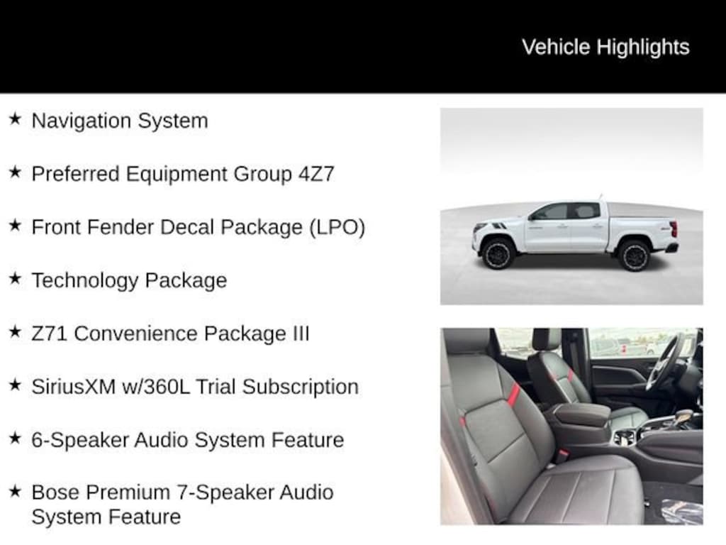 Factory MSRP: $52,135 $4,551 off MSRP! 4-Way Manual Passenger Seat Adjuster, 6-Speaker Audio System Feature, 8-Way Power Driver Seat Adjuster, ABS brakes, Adaptive Cruise Control, Air Conditioning, AM/FM radio: SiriusXM with 360L, Apple CarPlay/Android Auto, Auto-dimming Rear-View mirror, Automatic Emergency Braking, Bose Premium 7-Speaker Audio System Feature, Brake assist, Chevy Safety Assist, Cloth/Evotex Seat Trim, Driver Memory Settings, Driver Seatback Map Pocket, Dual front side impact airbags, Electronic Stability Control, Emergency communication system: OnStar, Following Distance Indicator, Forward Collision Alert, Front Center Armrest, Front dual zone A/C, Front reading lights, HD Surround Vision, Heated door mirrors, Heated front seats, Heated Steering Wheel, Illuminated entry, Navigation System, Outside temperature display, Perforated Leather-Appointed Seat Trim, Power door mirrors, Power driver seat, Power steering, Preferred Equipment Group 4Z7, Radio: 11.3 Diagonal Advanced Color LCD Display, Rear Center Armrest, Rear Pedestrian Alert, Remote keyless entry, Steering Wheel Mounted Audio Controls, Tachometer, Technology Package, Tilt steering wheel, Wheels: 18 x 8.5 Android Dark Full Gloss Aluminum, Wireless Phone Projection, Z71 Convenience Package III.