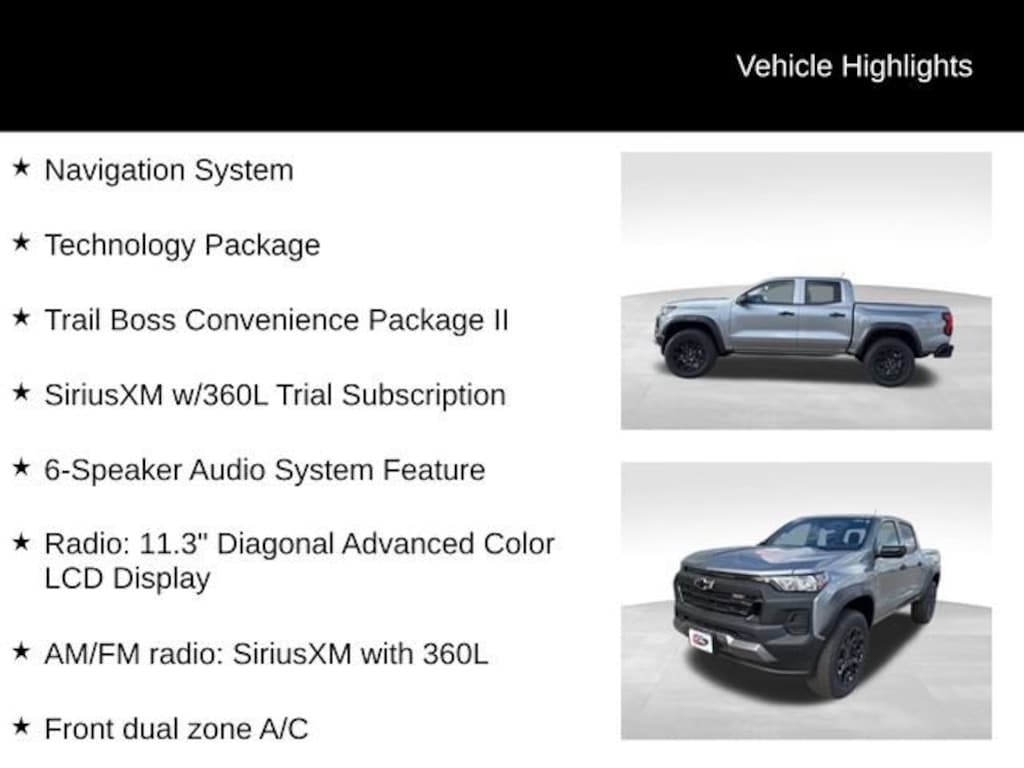 Factory MSRP: $46,870 $3,595 off MSRP! 4-Spoke Wrapped Steering Wheel, 4-Way Manual Passenger Seat Adjuster, 6-Speaker Audio System Feature, 6-Way Manual Driver Seat Adjuster, 8-Way Power Driver Seat Adjuster, Adaptive Cruise Control, Air Conditioning, AM/FM radio: SiriusXM with 360L, Electronic Stability Control, Evotex Seat Trim, Front Bucket Seats, Front dual zone A/C, HD Surround Vision, Heated Steering Wheel, Illuminated entry, Navigation System, Outside temperature display, Overhead console, Power Driver Lumbar Control Seat Adjuster, Radio: 11.3 Diagonal Advanced Color LCD Display, Rear Pedestrian Alert, Rear window defroster, Remote Vehicle Starter System, Steering Wheel Mounted Audio Controls, Technology Package, Trail Boss Convenience Package II, Wheels: 18 x 8.5 Black High Gloss Aluminum, Wireless Phone Charging, Wireless Phone Projection.