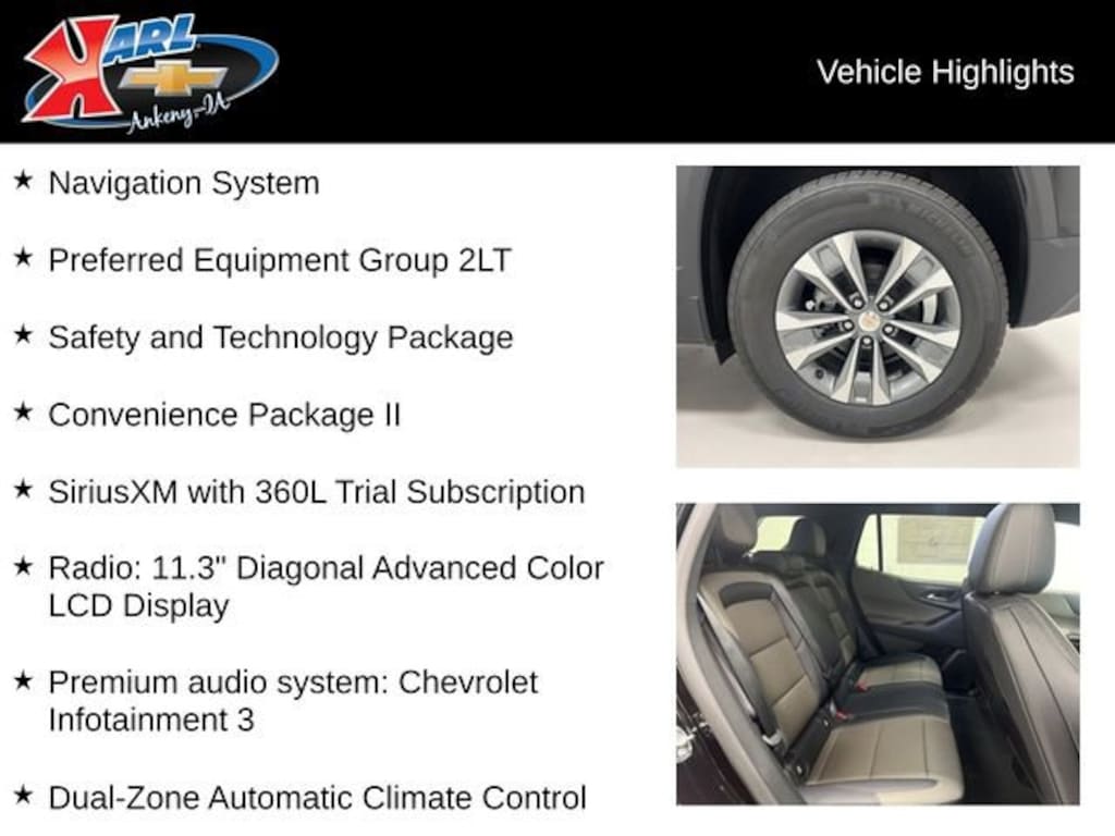 At Karl Chevrolet, we want to help you find the best new or used car in Ankeny that suits your needs. When you buy a new car at Karl Chevrolet, you know you're finding a vehicle you can rely on. We have a great selection of Platinum Quality Pre-Owned Vehicles. We also pride ourselves in creating a friendly atmosphere and a reliable Dealership that you can trust. Call us and our experts will be glad to help you! (515) 299-4300. *Equipment and options are generated by a 3rd party vendor, exact vehicle options may vary. Please see a salesperson for complete details and vehicle information.