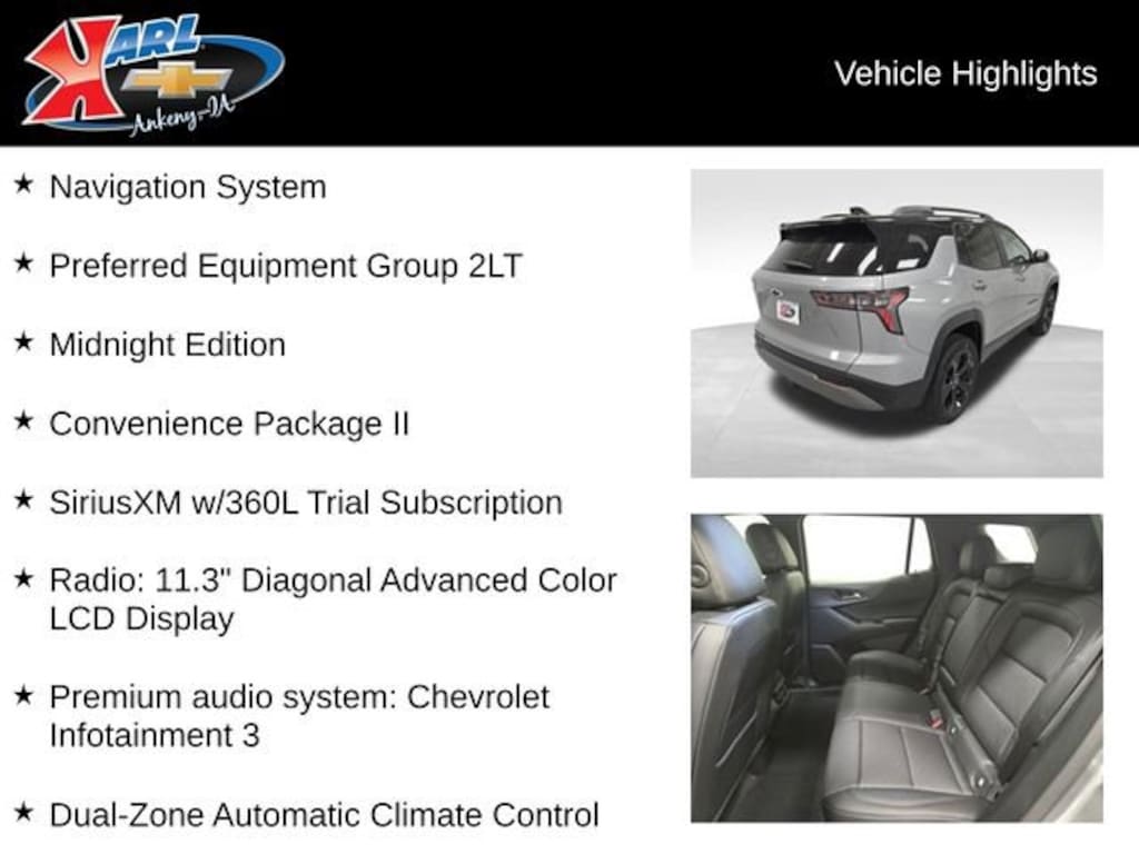 Factory MSRP: $36,085 24/29 City/Highway MPG AWD, 2-Way Power Driver Lumbar Control Seat Adjuster, AutoSense Hands-Free Power Programmable Liftgate, Cabin Humidity & Windshield Sensor, Convenience Package II, Driver 6-Way Manual Seat Adjuster, Driver 8-Way Power Seat Adjuster, Dual-Zone Automatic Climate Control, Evotex Seat Trim, Front Bucket Seats, Front Center Armrest, Front Passenger 4-Way Manual Seat Adjuster, Heated Driver & Front Passenger Seats, Heated Wiper Park, High Gloss Black Mirror Caps, Intermittent Front Rain-Sensing Wipers, Midnight Edition, Navigation System, Overhead Sunglass Storage, Preferred Equipment Group 2LT, Premium audio system: Chevrolet Infotainment 3, Programmable Universal Home Remote, Radio: 11.3 Diagonal Advanced Color LCD Display, SiriusXM w/360L Trial Subscription, Split folding rear seat, Wheels: 19 Black Painted Aluminum, Wireless Phone Charging for Portable Devices.