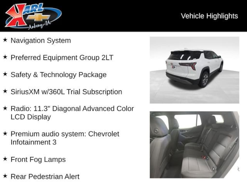 Factory MSRP: $33,440 24/29 City/Highway MPG AWD, Driver 6-Way Manual Seat Adjuster, Front Bucket Seats, Front Center Armrest, Front Fog Lamps, Front Passenger 4-Way Manual Seat Adjuster, HD Surround Vision, Heated Driver & Front Passenger Seats, Navigation System, Preferred Equipment Group 2LT, Premium audio system: Chevrolet Infotainment 3, Radio: 11.3 Diagonal Advanced Color LCD Display, Rear Pedestrian Alert, Safety & Technology Package, SiriusXM w/360L Trial Subscription, Split folding rear seat, Traffic Sign Recognition, Wheels: 17 Grazen Metallic Machined-Face Aluminum.Summit White 2026 Chevrolet Equinox LT 4D Sport Utility 1.5L DOHC 8-Speed Automatic AWD EXPIRES NOVEMBER 1