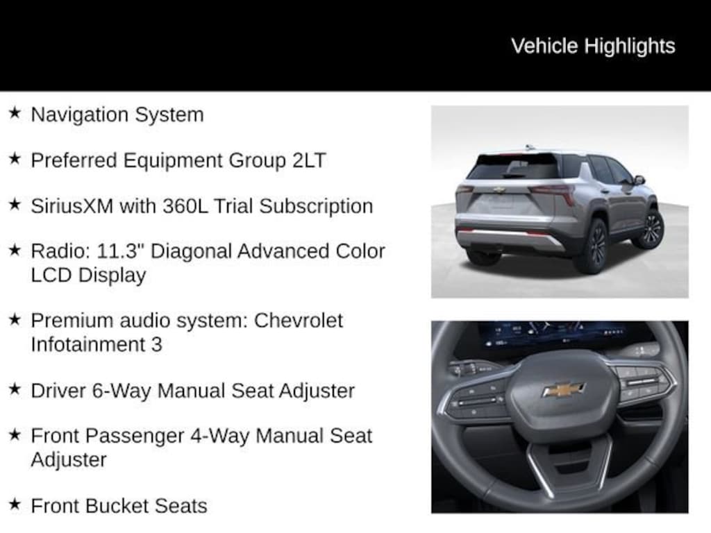 Beyond its performance, the Equinox LT is packed with a wealth of features designed to enhance your driving experience. The premium audio system with the Chevrolet Infotainment 3 system and 11.3 diagonal advanced color LCD display keeps you connected and entertained, while the navigation system ensures you always know where you're going. The heated front seats and steering wheel provide comfort on even the coldest days, and the split-folding rear seat offers versatility to accommodate your cargo needs.
