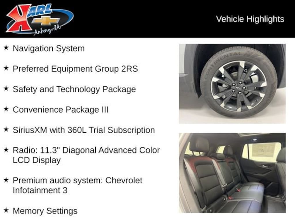 At Karl Chevrolet we want to help you find the best new or used car in Ankeny that suits your needs. When you buy a new car at Karl Chevrolet you know you're finding a vehicle you can rely on. We have a great selection of Platinum Quality Pre-Owned Vehicles. We also pride ourselves in creating a friendly atmosphere and a reliable Dealership that you can trust. Call us and our experts will be glad to help you! (515) 299-4300. *Equipment and options are generated by a 3rd party vendor, exact vehicle options may vary. Please see a salesperson for complete details and vehicle information.