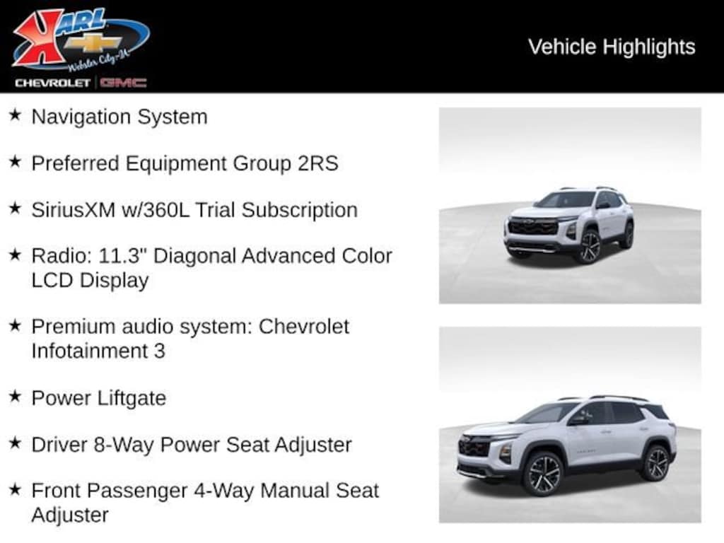 AWD, 2-Way Power Driver Lumbar Control Seat Adjuster, Driver 8-Way Power Seat Adjuster, Evotex Seat Trim, Front Bucket Seats, Front Center Armrest, Front Passenger 4-Way Manual Seat Adjuster, Heated Driver & Front Passenger Seats, Navigation System, Power Liftgate, Preferred Equipment Group 2RS, Premium audio system: Chevrolet Infotainment 3, Radio: 11.3 Diagonal Advanced Color LCD Display, SiriusXM w/360L Trial Subscription, Split folding rear seat, Wheels: 20 Black Machined-Face Aluminum. Polar White 2026 Chevrolet Equinox RS 4D Sport Utility 1.5L DOHC 24/29 City/Highway MPG 8-Speed Automatic AWD
