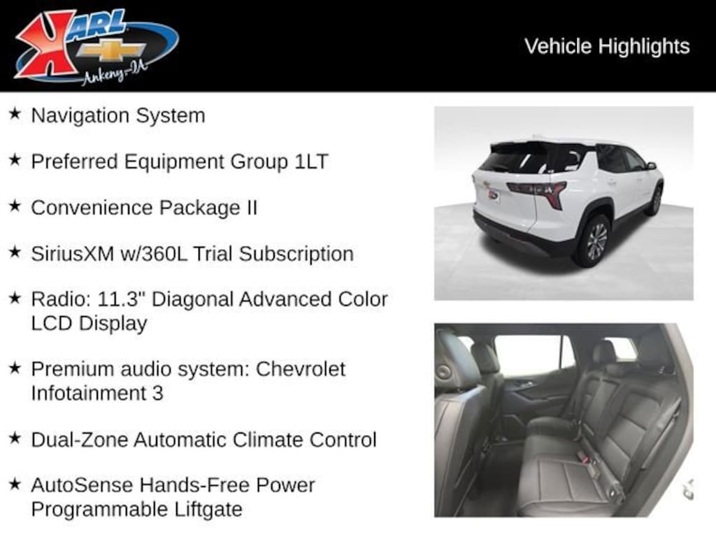 Factory MSRP: $32,545 26/28 City/Highway MPG 2-Way Power Driver Lumbar Control Seat Adjuster, AutoSense Hands-Free Power Programmable Liftgate, Cabin Humidity & Windshield Sensor, Convenience Package II, Driver 6-Way Manual Seat Adjuster, Driver 8-Way Power Seat Adjuster, Dual-Zone Automatic Climate Control, Evotex Seat Trim, Front Bucket Seats, Front Center Armrest, Front Passenger 4-Way Manual Seat Adjuster, Heated Driver & Front Passenger Seats, Heated Wiper Park, Intermittent Front Rain-Sensing Wipers, Navigation System, Overhead Sunglass Storage, Preferred Equipment Group 1LT, Premium audio system: Chevrolet Infotainment 3, Programmable Universal Home Remote, Radio: 11.3 Diagonal Advanced Color LCD Display, SiriusXM w/360L Trial Subscription, Split folding rear seat, Wheels: 17 Grazen Metallic Machined-Face Aluminum, Wireless Phone Charging for Portable Devices.