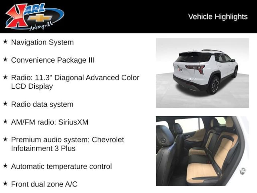 Factory MSRP: $40,285 $2,280 off MSRP! 25/29 City/Highway MPG AWD, 2-Way Power Driver Lumbar Control Seat Adjuster, Air Conditioning, AM/FM radio: SiriusXM, Automatic temperature control, Brake assist, Convenience Package III, Driver door bin, Driver vanity mirror, Dual front impact airbags, Dual front side impact airbags, Electronic Stability Control, Front anti-roll bar, Front Bucket Seats, Front Center Armrest, Front dual zone A/C, Front Fog Lamps, Front Passenger 2-Way Power Lumbar Seat Adjuster, Front Passenger 8-Way Power Seat Adjuster, Front reading lights, Garage door transmitter, HD Surround Vision, Heated Rear Outboard Seating Positions, Heated steering wheel, Memory Settings, Navigation System, Occupant sensing airbag, Overhead airbag, Overhead console, Passenger vanity mirror, Power Liftgate, Premium audio system: Chevrolet Infotainment 3 Plus, Radio data system, Radio: 11.3 Diagonal Advanced Color LCD Display, Rain sensing wipers, Rear Pedestrian Alert, Rear reading lights, Rear window wiper, Split folding rear seat, Tilt steering wheel, Traffic Sign Recognition, Ventilated Driver Seat, Ventilated Front Passenger Seat.