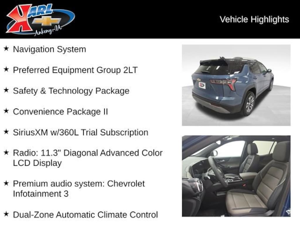 Factory MSRP: $37,630 $750 off MSRP! 24/29 City/Highway MPG AWD, 2-Way Power Driver Lumbar Control Seat Adjuster, AutoSense Hands-Free Power Programmable Liftgate, Cabin Humidity & Windshield Sensor, Convenience Package II, Driver 6-Way Manual Seat Adjuster, Driver 8-Way Power Seat Adjuster, Dual-Zone Automatic Climate Control, Evotex Seat Trim, Front Bucket Seats, Front Center Armrest, Front Fog Lamps, Front Passenger 4-Way Manual Seat Adjuster, HD Surround Vision, Heated Driver & Front Passenger Seats, Heated Wiper Park, Intermittent Front Rain-Sensing Wipers, Navigation System, Overhead Sunglass Storage, Power Dual Glass Panoramic Sliding Sunroof, Preferred Equipment Group 2LT, Premium audio system: Chevrolet Infotainment 3, Programmable Universal Home Remote, Radio: 11.3 Diagonal Advanced Color LCD Display, Rear Pedestrian Alert, Roof Rails, Safety & Technology Package, SiriusXM w/360L Trial Subscription, Split folding rear seat, Traffic Sign Recognition, Wheels: 17 Grazen Metallic Machined-Face Aluminum, Wireless Phone Charging for Portable Devices.