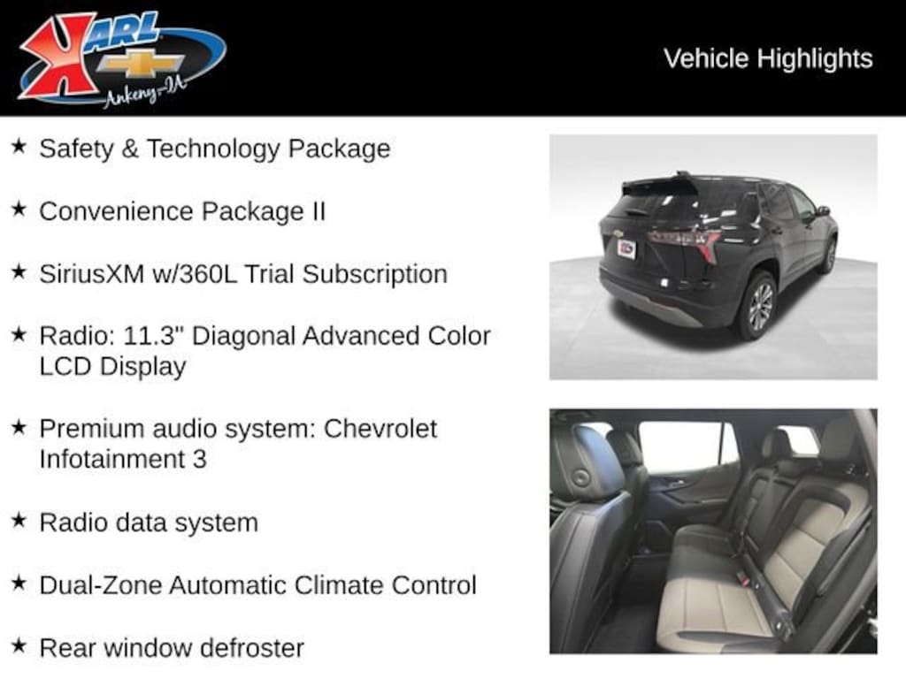 Factory MSRP: $35,490 24/29 City/Highway MPG AWD, 2-Way Power Driver Lumbar Control Seat Adjuster, Air Conditioning, Brake assist, Cloth Seat Trim, Compass, Convenience Package II, Driver 8-Way Power Seat Adjuster, Dual front impact airbags, Dual front side impact airbags, Dual-Zone Automatic Climate Control, Electronic Stability Control, Emergency communication system: OnStar and Chevrolet connected services capable, Evotex Seat Trim, Front Bucket Seats, Front Center Armrest, Front Fog Lamps, Front Passenger 4-Way Manual Seat Adjuster, HD Surround Vision, Heated door mirrors, Heated steering wheel, Heated Wiper Park, Illuminated entry, Intermittent Front Rain-Sensing Wipers, Low tire pressure warning, Occupant sensing airbag, Overhead Sunglass Storage, Power windows, Premium audio system: Chevrolet Infotainment 3, Programmable Universal Home Remote, Radio data system, Radio: 11.3 Diagonal Advanced Color LCD Display, Rear Pedestrian Alert, Rear seat center armrest, Rear window defroster, Rear window wiper, Remote keyless entry, Split folding rear seat, Tachometer, Traffic Sign Recognition, Wheels: 17 Grazen Metallic Machined-Face Aluminum.Black 2026 Chevrolet Equinox LT 4D Sport Utility 1.5L DOHC 8-Speed Automatic AWD