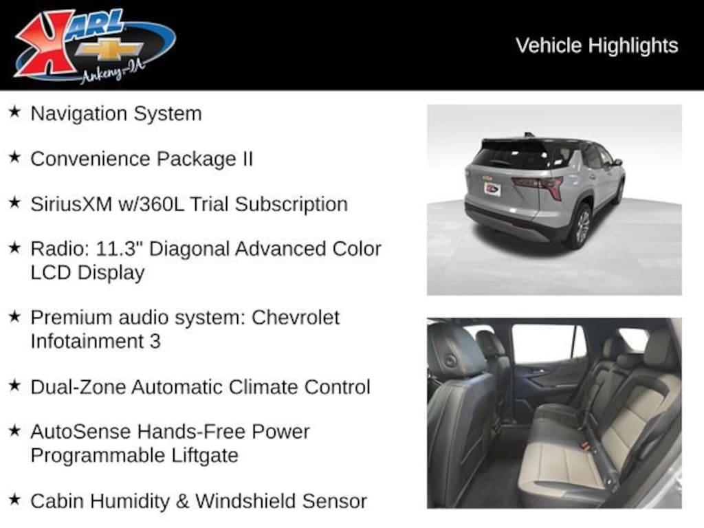 Factory MSRP: $35,040 24/29 City/Highway MPG AWD, 2-Way Power Driver Lumbar Control Seat Adjuster, AutoSense Hands-Free Power Programmable Liftgate, Cabin Humidity & Windshield Sensor, Convenience Package II, Driver 6-Way Manual Seat Adjuster, Driver 8-Way Power Seat Adjuster, Dual-Zone Automatic Climate Control, Evotex Seat Trim, Front Bucket Seats, Front Center Armrest, Front Passenger 4-Way Manual Seat Adjuster, Heated Driver & Front Passenger Seats, Heated Wiper Park, Intermittent Front Rain-Sensing Wipers, Navigation System, Overhead Sunglass Storage, Premium audio system: Chevrolet Infotainment 3, Programmable Universal Home Remote, Radio: 11.3 Diagonal Advanced Color LCD Display, SiriusXM w/360L Trial Subscription, Split folding rear seat, Wheels: 17 Grazen Metallic Machined-Face Aluminum, Wireless Phone Charging for Portable Devices.