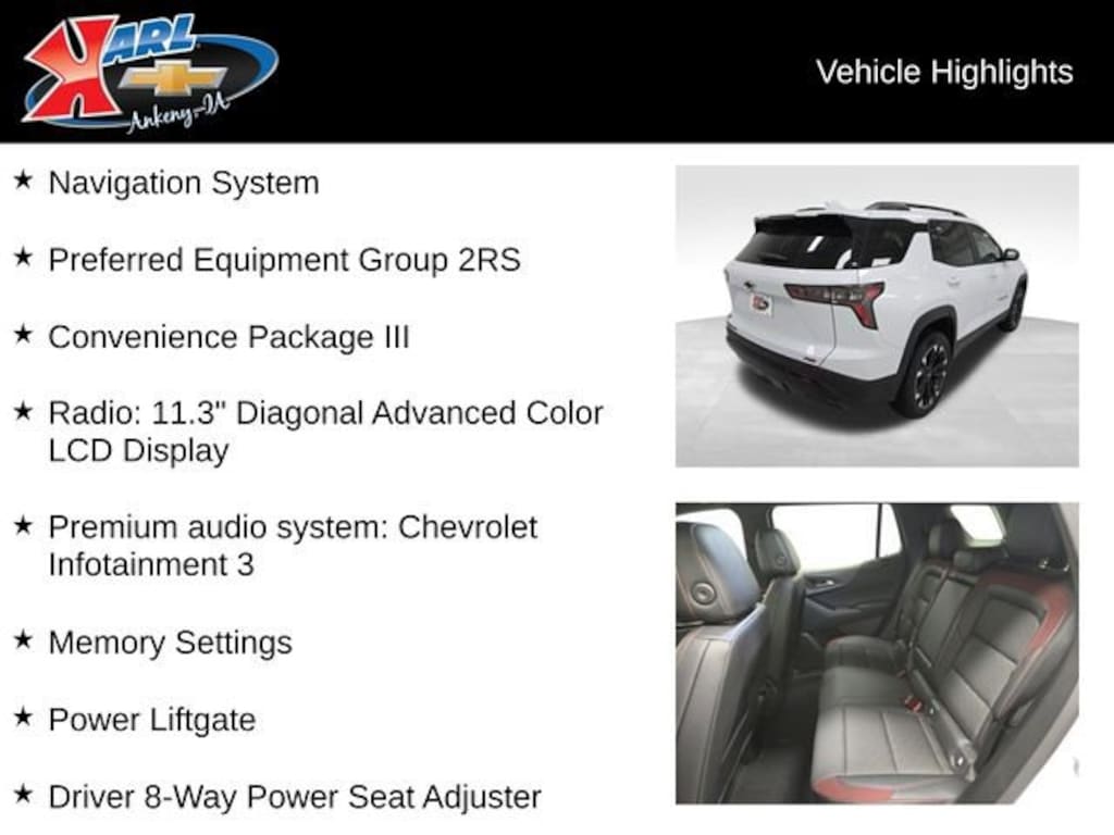 Factory MSRP: $39,340 $3,709 off MSRP! 24/29 City/Highway MPG AWD, 2-Way Power Driver Lumbar Control Seat Adjuster, Convenience Package III, Driver 8-Way Power Seat Adjuster, Evotex Seat Trim, Front Bucket Seats, Front Center Armrest, Front Passenger 2-Way Power Lumbar Seat Adjuster, Front Passenger 4-Way Manual Seat Adjuster, Front Passenger 8-Way Power Seat Adjuster, Heated Rear Outboard Seating Positions, Memory Settings, Navigation System, Power Liftgate, Preferred Equipment Group 2RS, Premium audio system: Chevrolet Infotainment 3, Radio: 11.3 Diagonal Advanced Color LCD Display, Split folding rear seat, Ventilated Driver Seat, Ventilated Front Passenger Seat, Wheels: 19 Carbon Flash Metallic Aluminum.